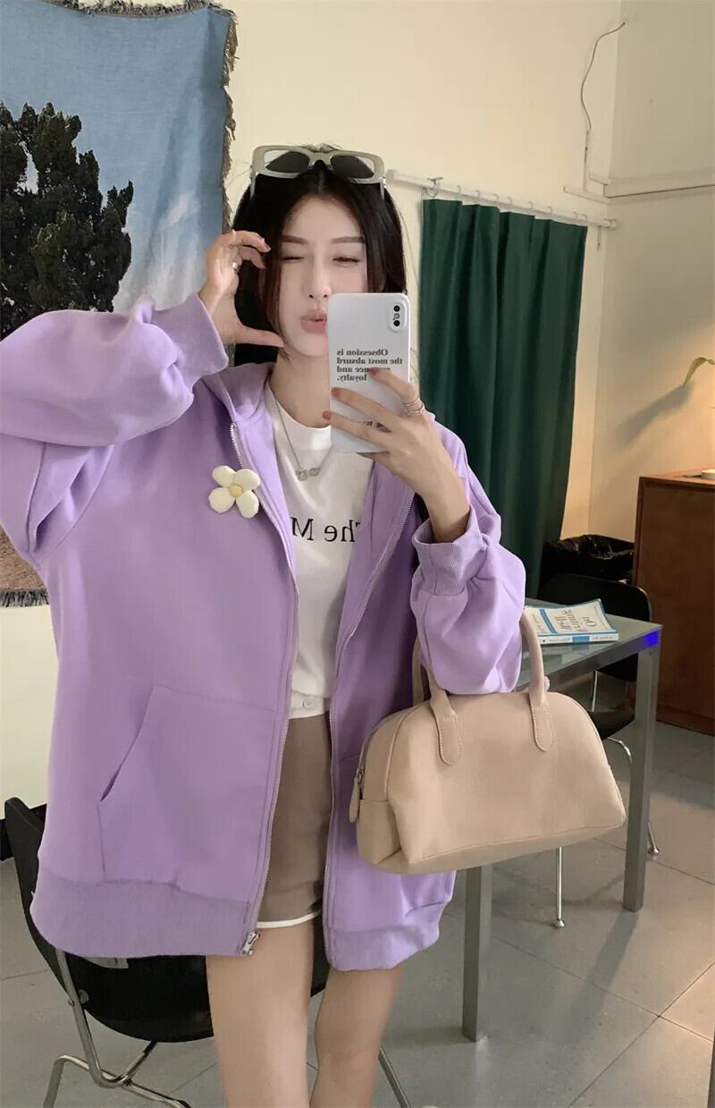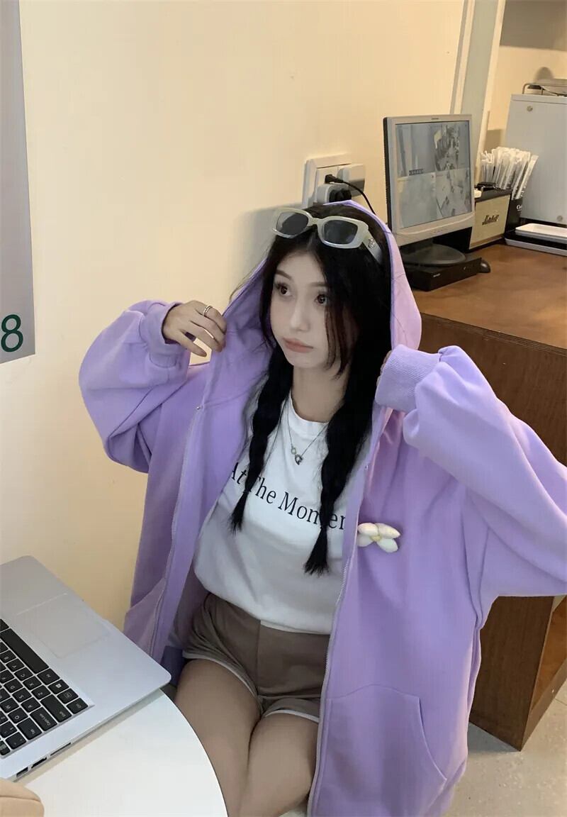 甘いホットガールライトパープルフード付きスウェットシャツ秋スタイルルーズミッドレングスコート 大人ガーリー スウィート キュート カジュアル オータム 秋物