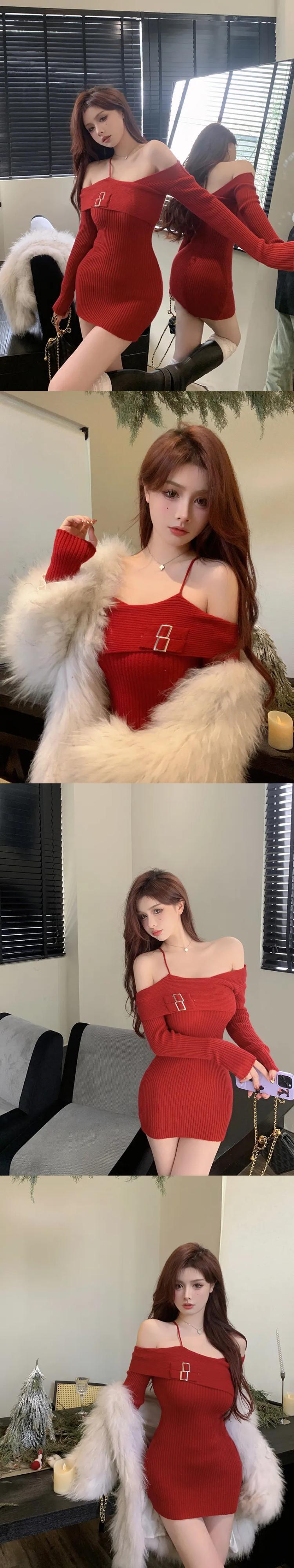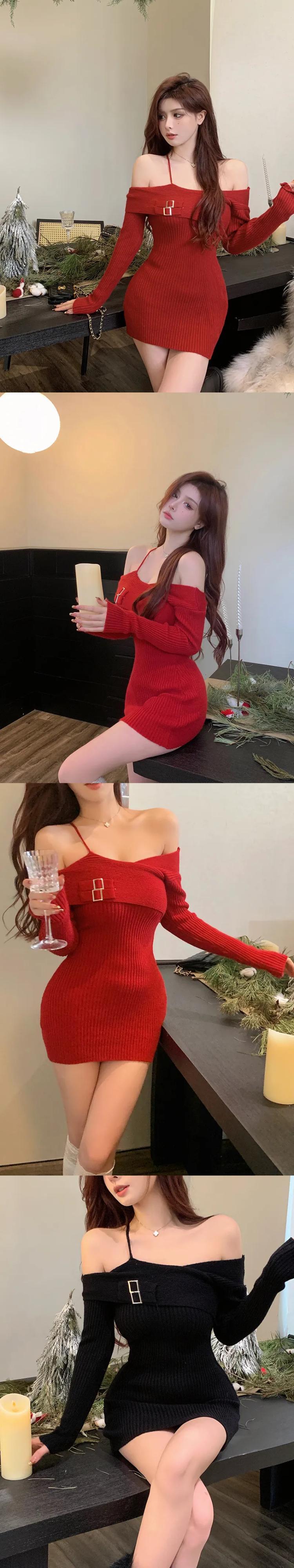 ホットガール純粋セクシーオフショルダーニットドレス秋と冬スリムフィットラップヒップセーターショートドレス オータム 秋物 ウィンター 冬物 ピュア