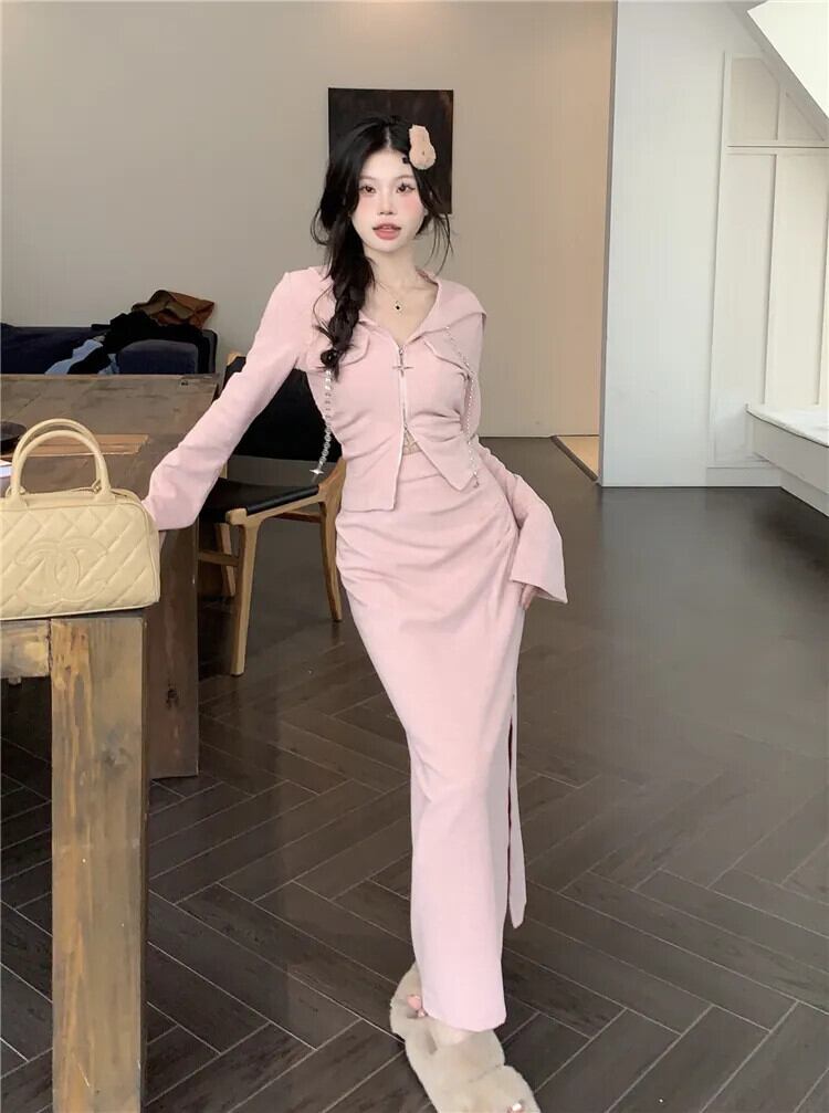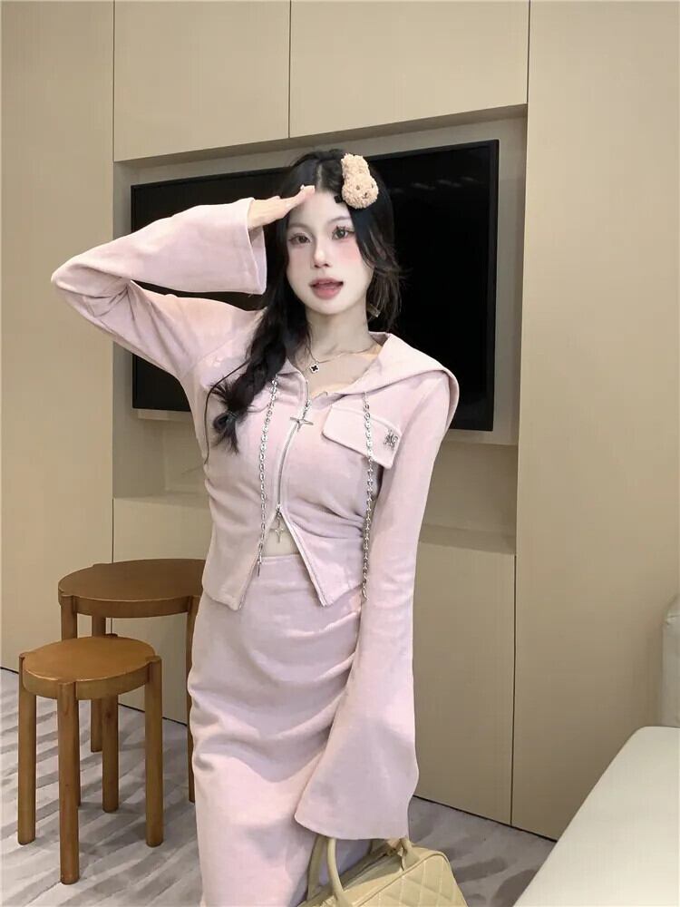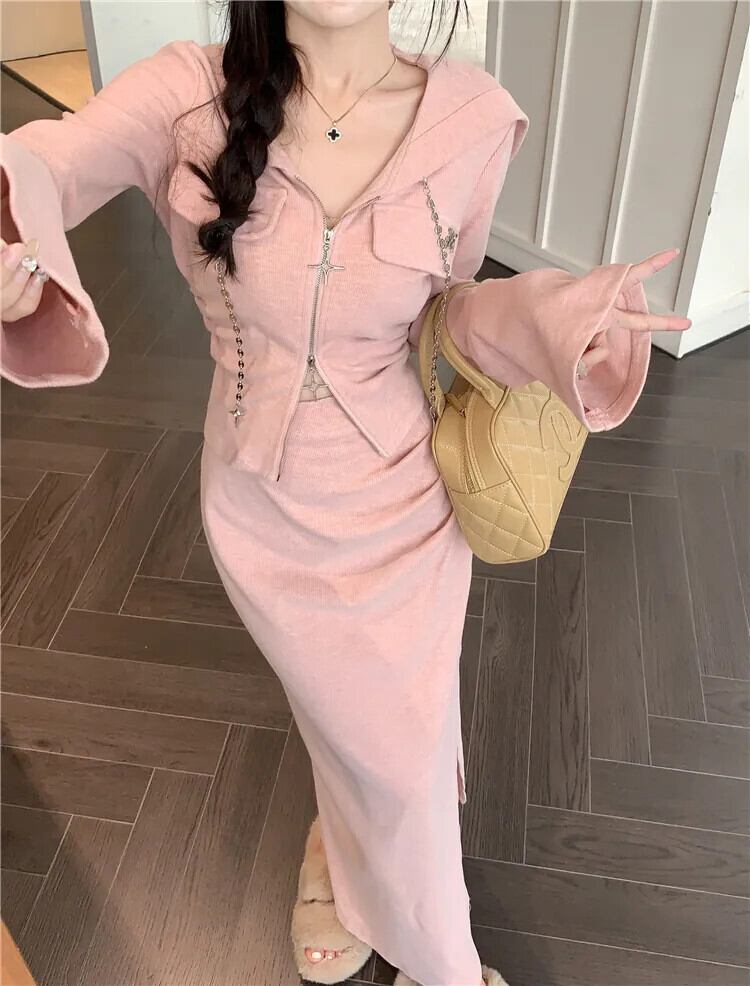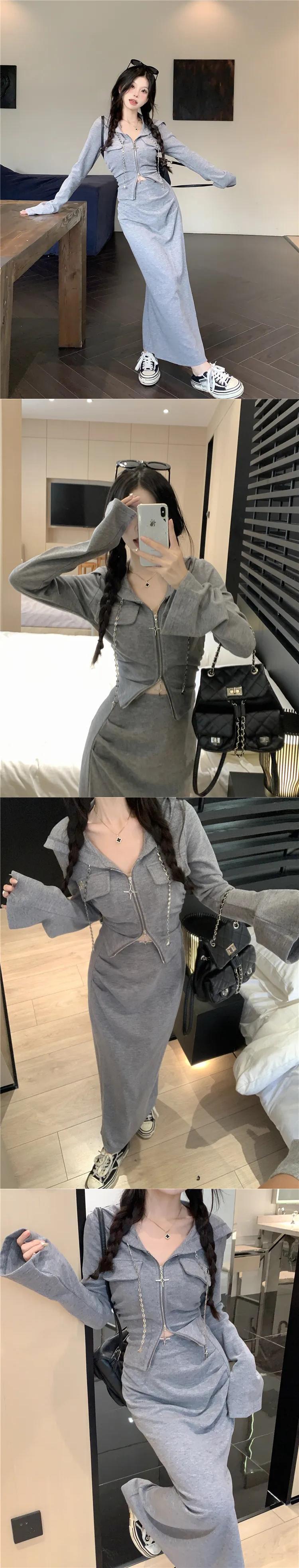 甘いホットガールスーツ秋チェーンフード付きトレーナースプリットラップヒップロングスカートグレーツーピースセット 大人ガーリー スウィート キュート カジュアル オータム 秋物
