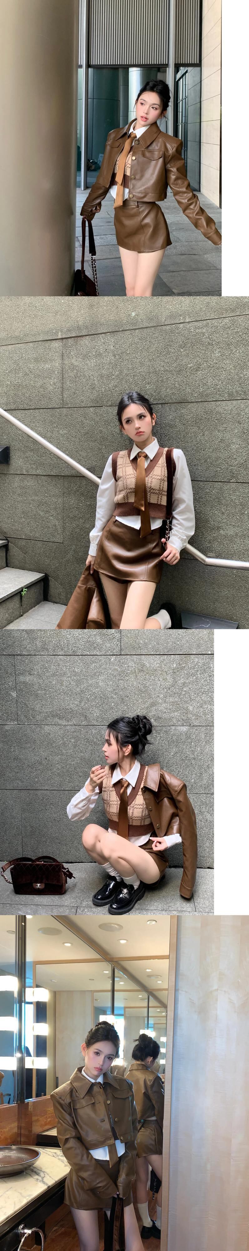 香港ホットガールスーツ秋ターンダウン襟レザーコートベストシャツラップヒップミニスカート 3 点セット オータム 秋物