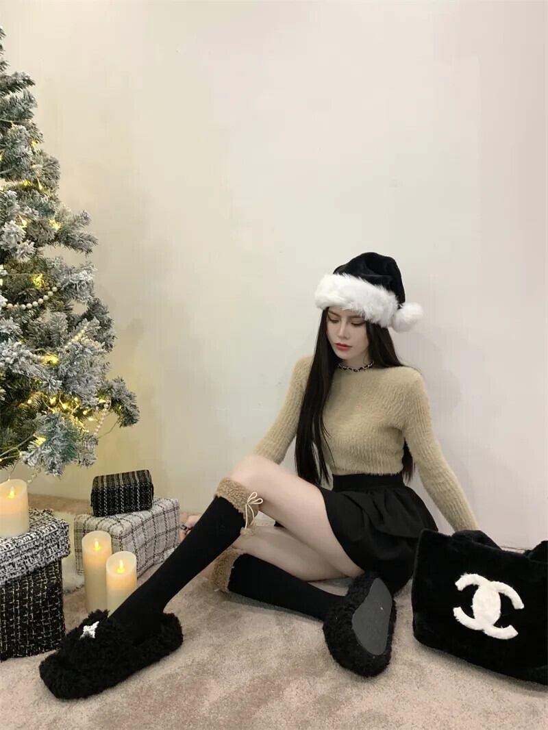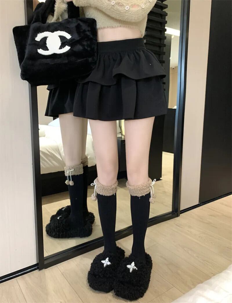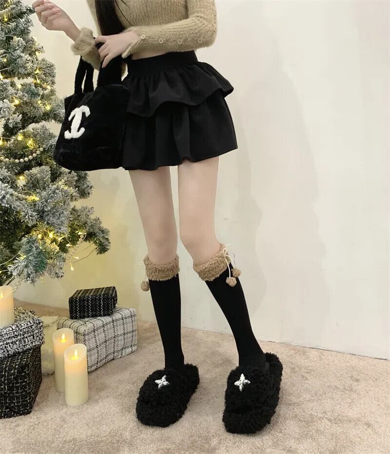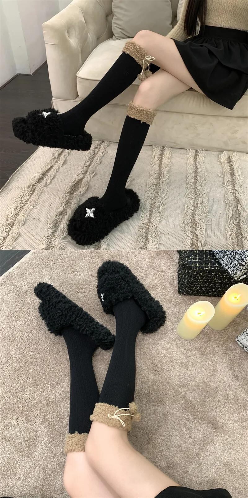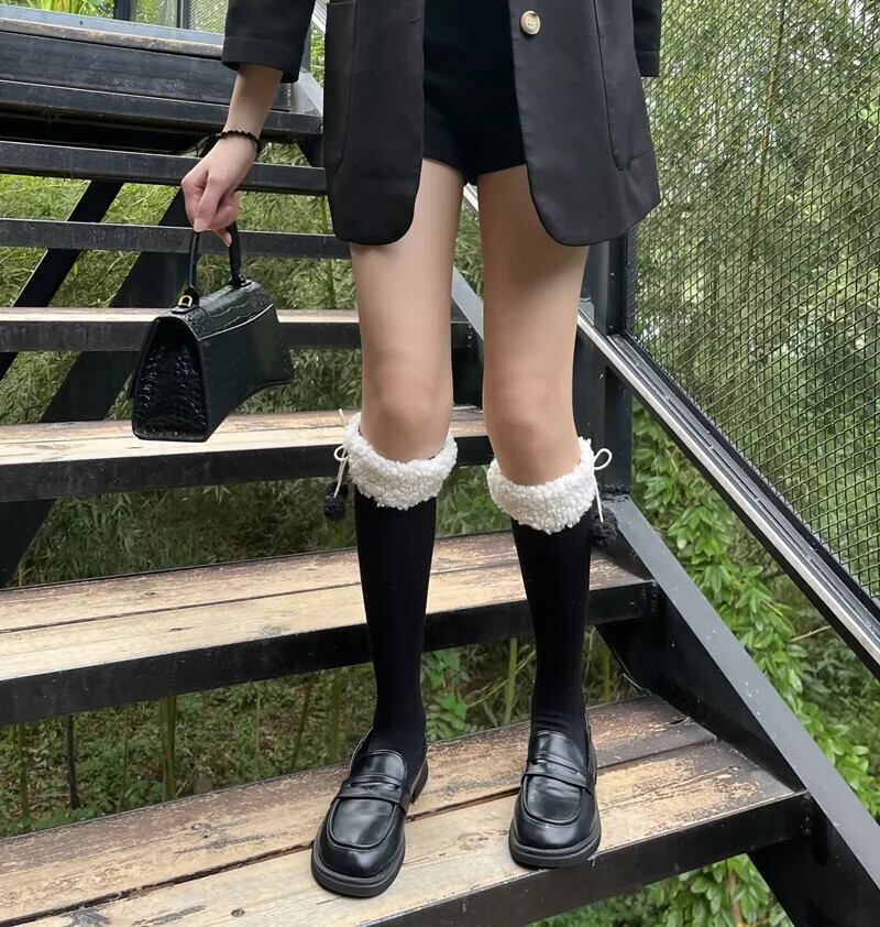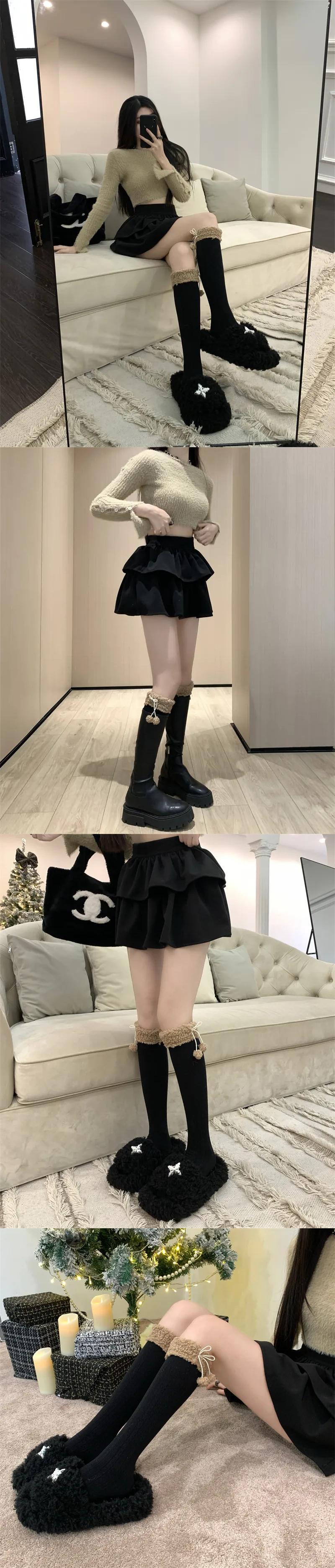 甘いホットガールラムファーボーダーミディアムホースウール秋かわいいカーフソックスツイストラインパイルソックス 大人ガーリー スウィート キュート カジュアル オータム 秋物 タイツ ストッキング
