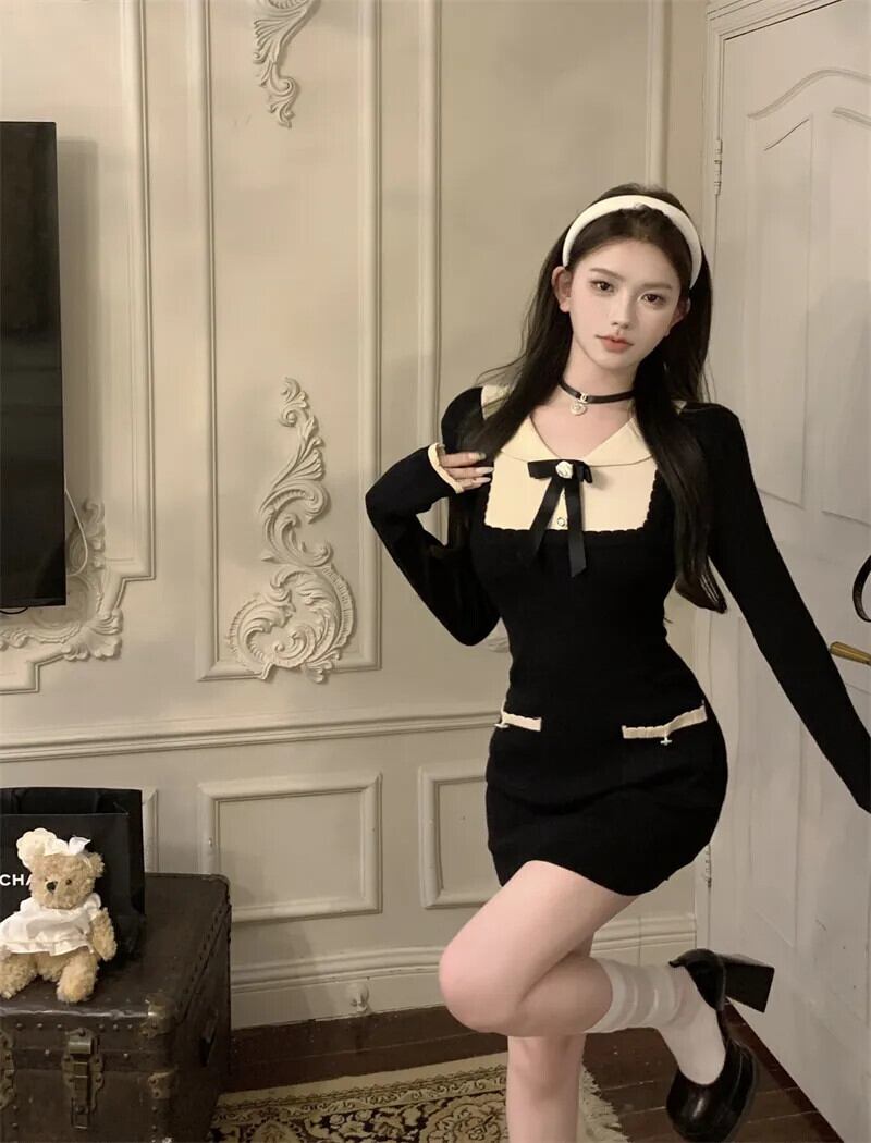 フレンチスタイル甘いホットガールリボンニットドレス秋ターンダウン襟スリムフィット長袖ショートドレス ロング 大人ガーリー スウィート キュート カジュアル オータム 秋物
