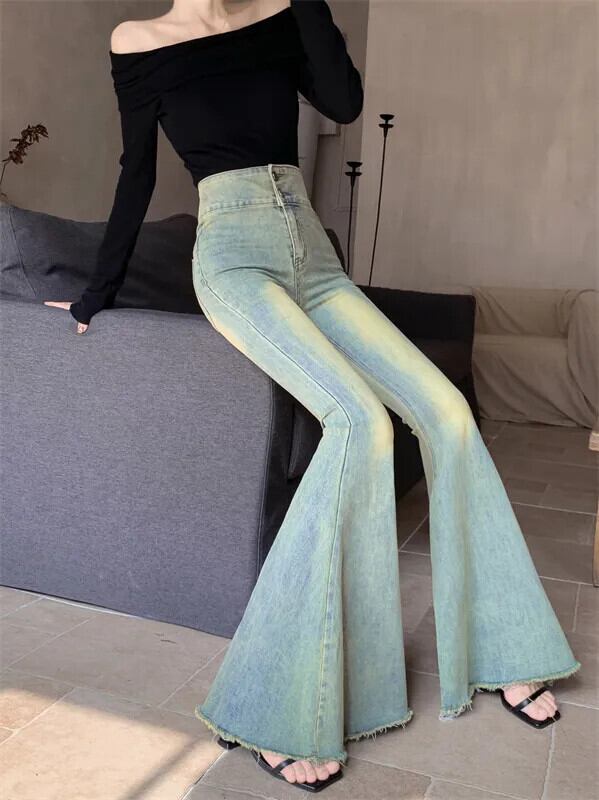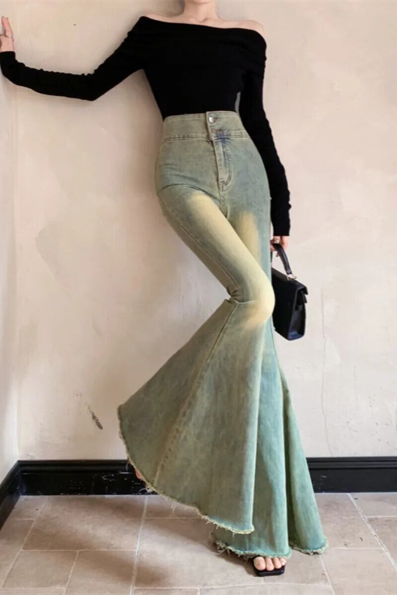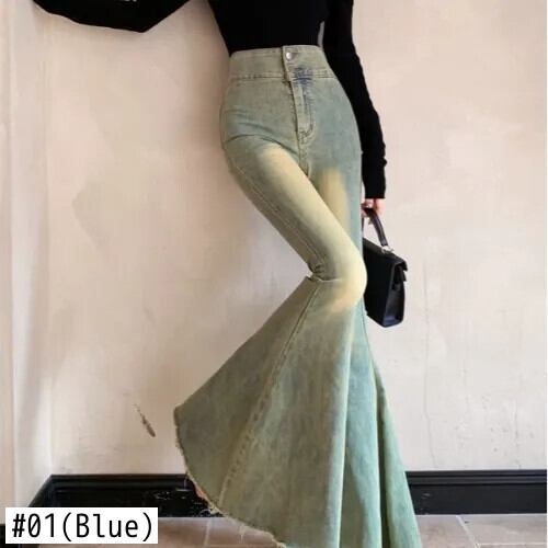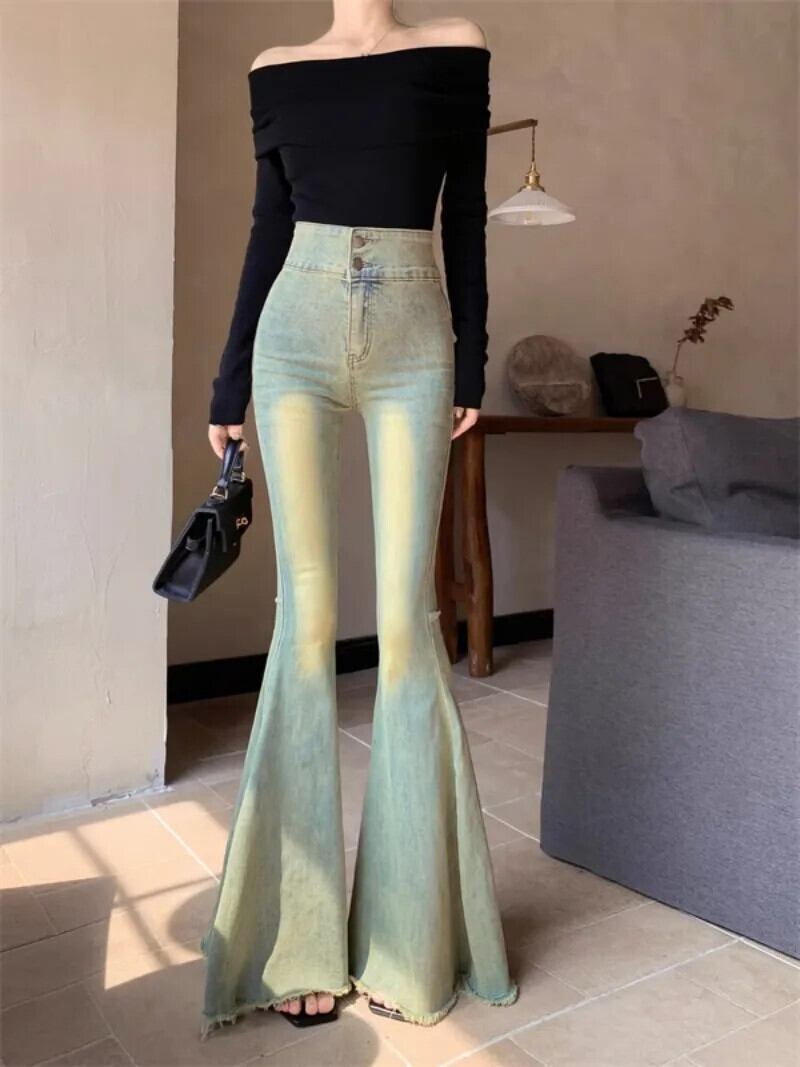 ホットガールレトロスタイルダブルボタンウエストスリムフィットジーンズ秋多用途フレアワイドレッグジーンズ オータム 秋物 ワイドパンツ