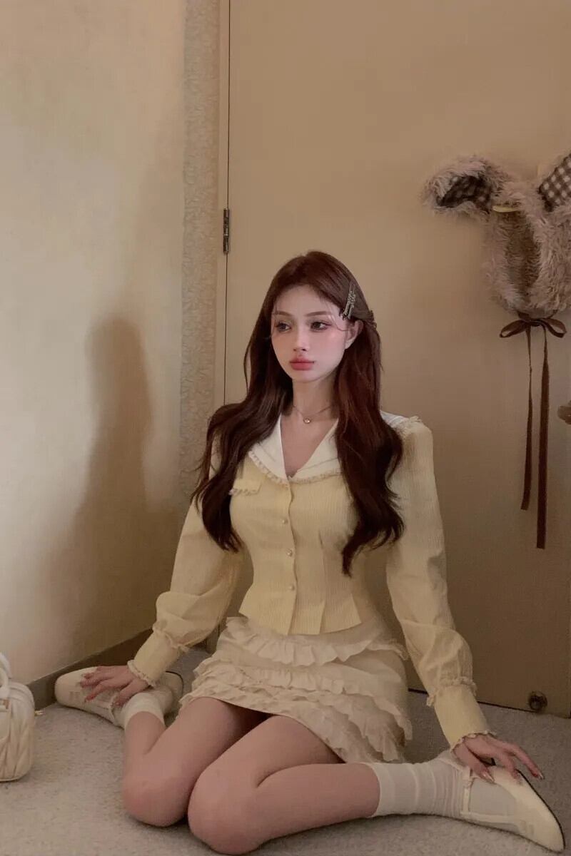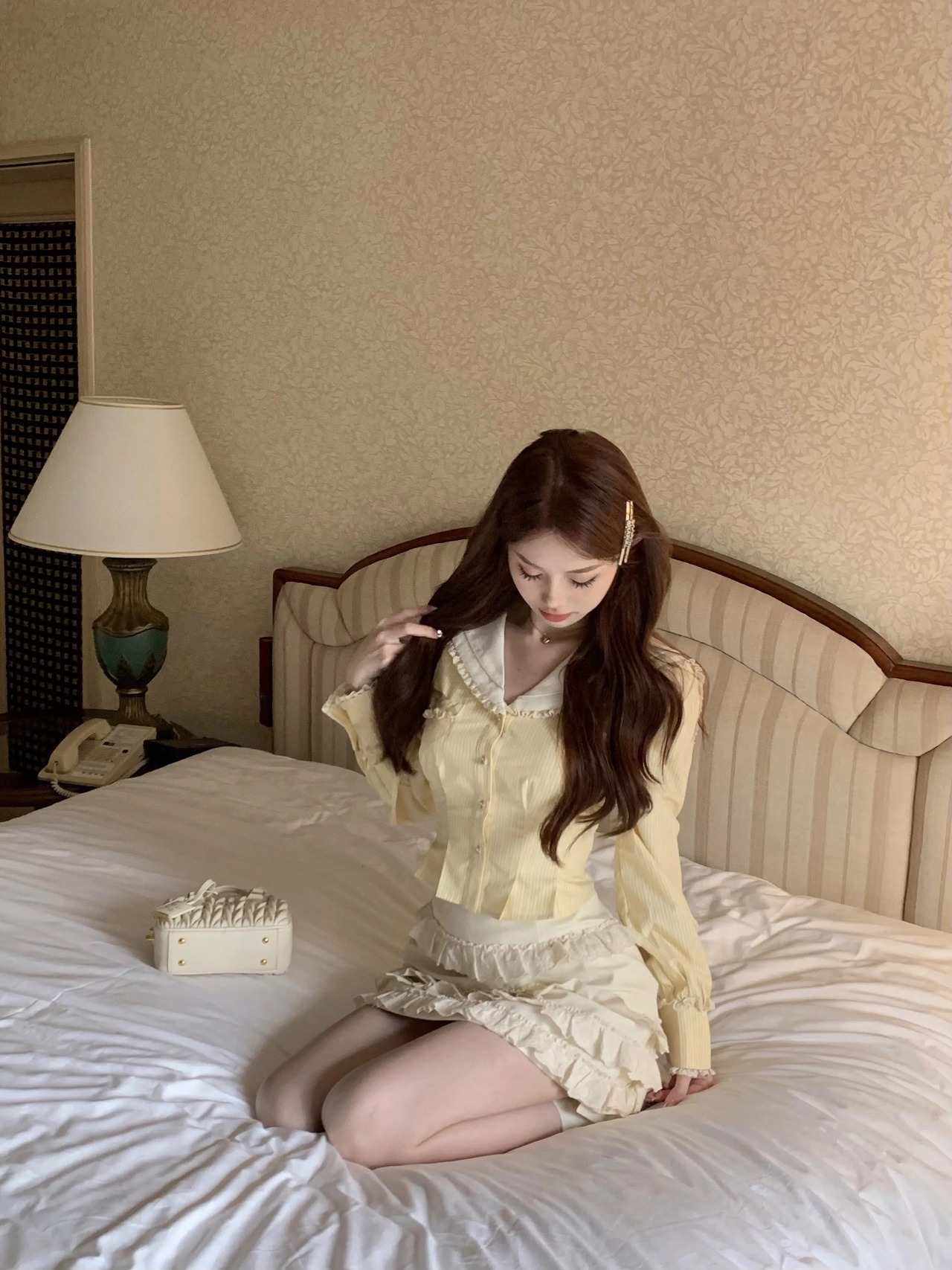フレンチスイートガールスーツ秋セーラー襟ストライプショートシャツレースケーキミニスカートツーピースセット 大人ガーリー スウィート キュート カジュアル オータム 秋物