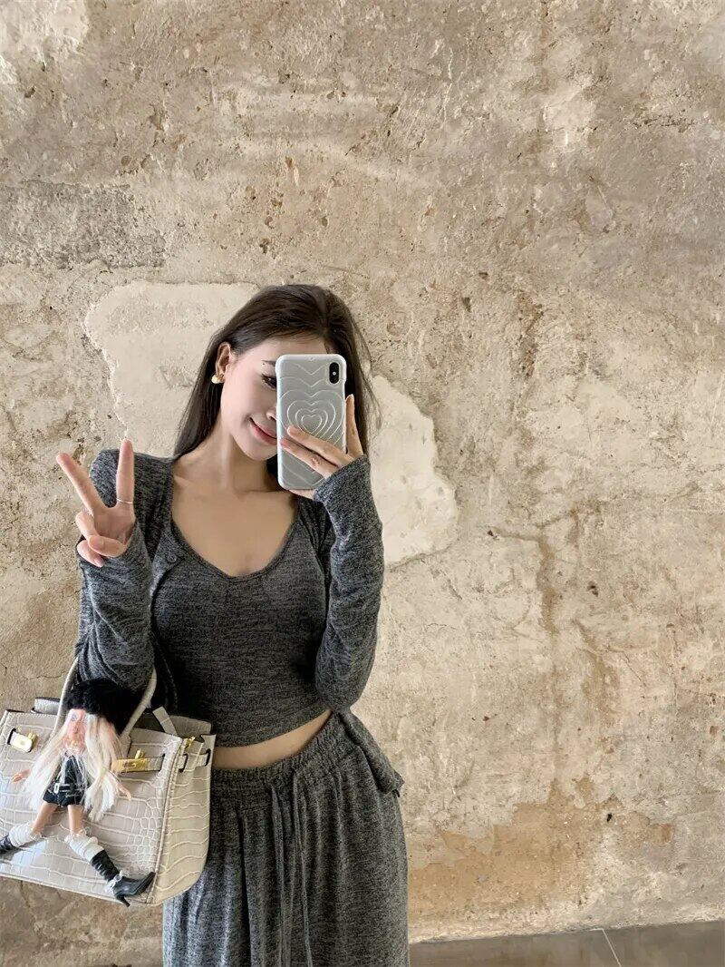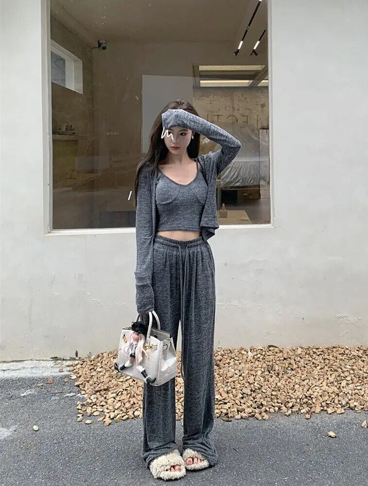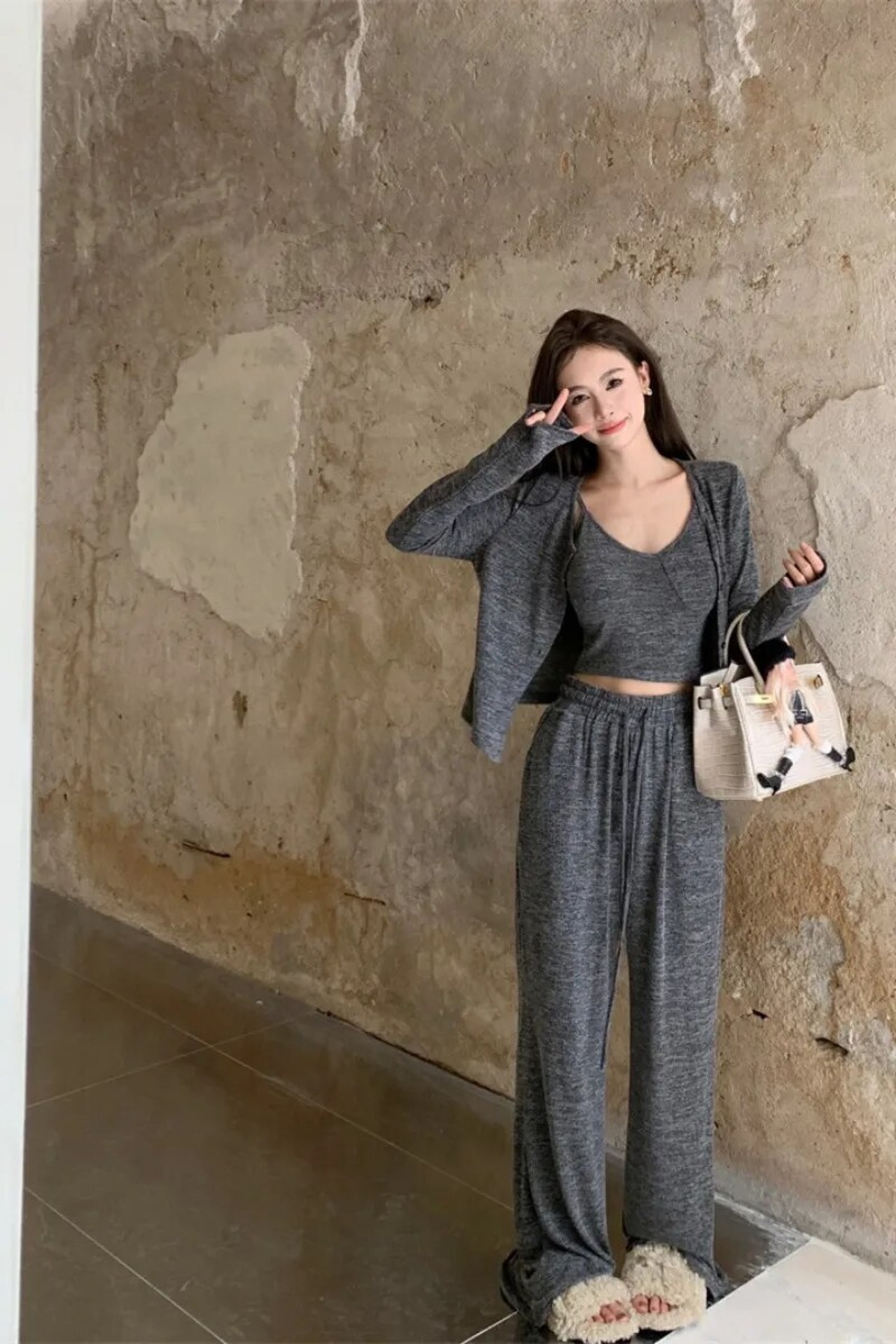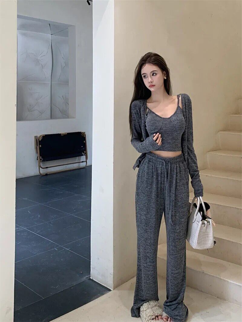 グレースーツ秋ニットカーディガンサスペンダーベストウエストワイドレッグパンツ 3 点セット オータム 秋物 ワイドパンツ