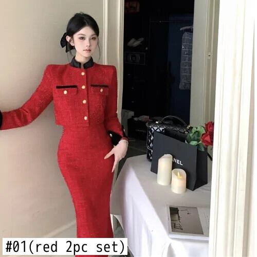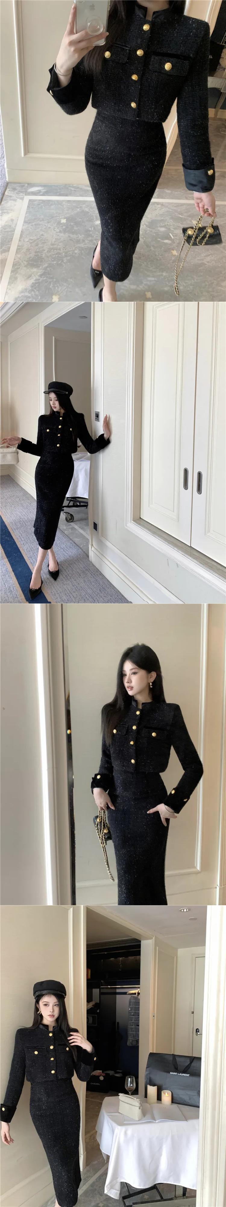 フレンチスタイルスウィートガールスーツ秋スタンドカラーショートコートウエストロングスカートツーピースセット 大人ガーリー キュート カジュアル オータム 秋物