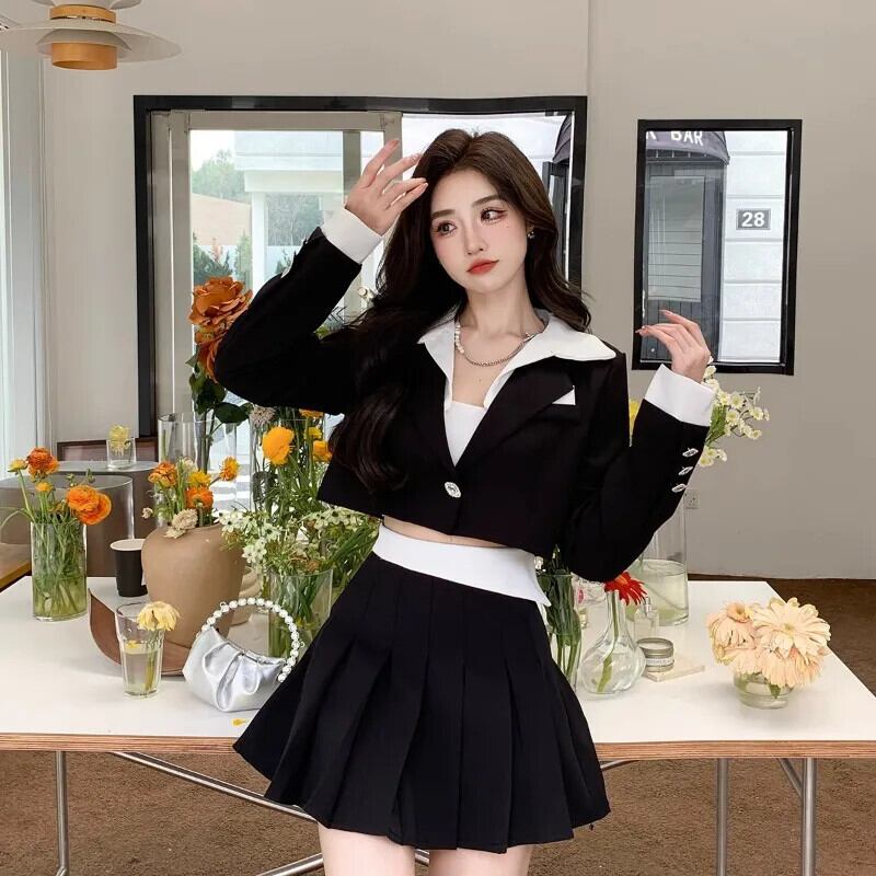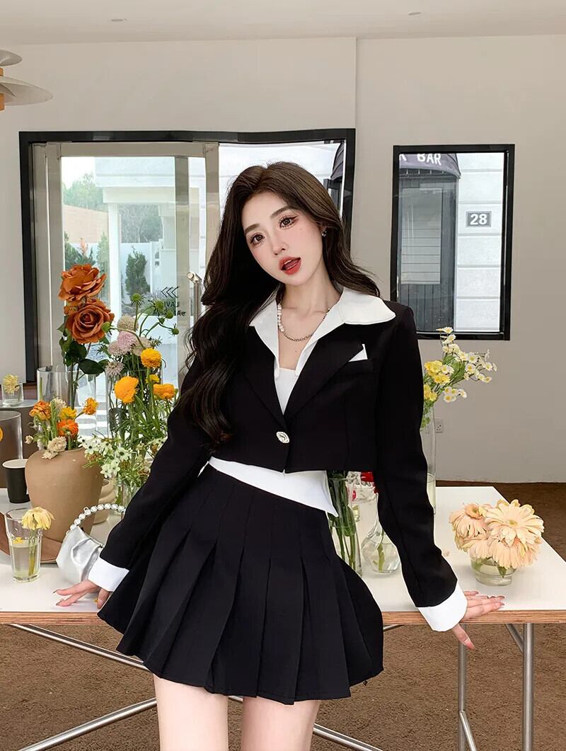 スイートホットガールスーツレディーススプライシングショートコートトップウエストAラインミニスカートツーピースセット 大人ガーリー スウィート キュート カジュアル