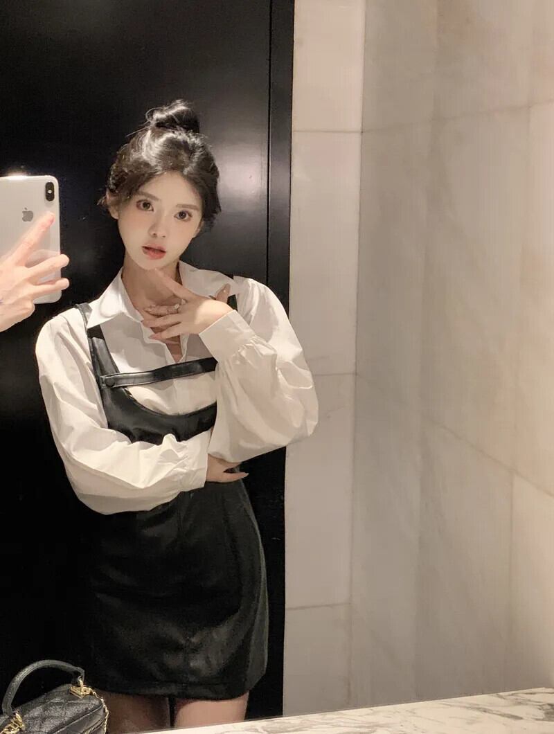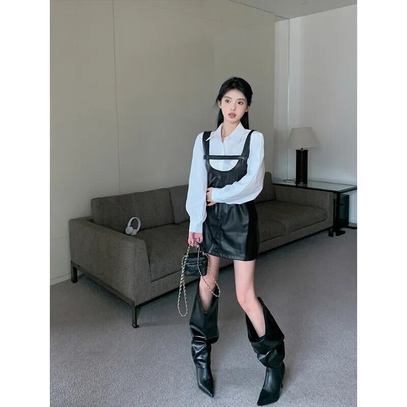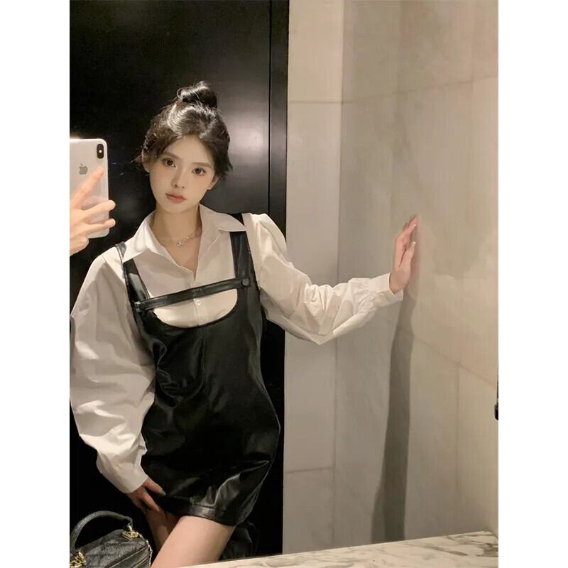 ホットガールスーツ秋ストラップドレス Pu レザーショートドレス白長袖シャツ 2 点セット ロング ホワイト オータム 秋物