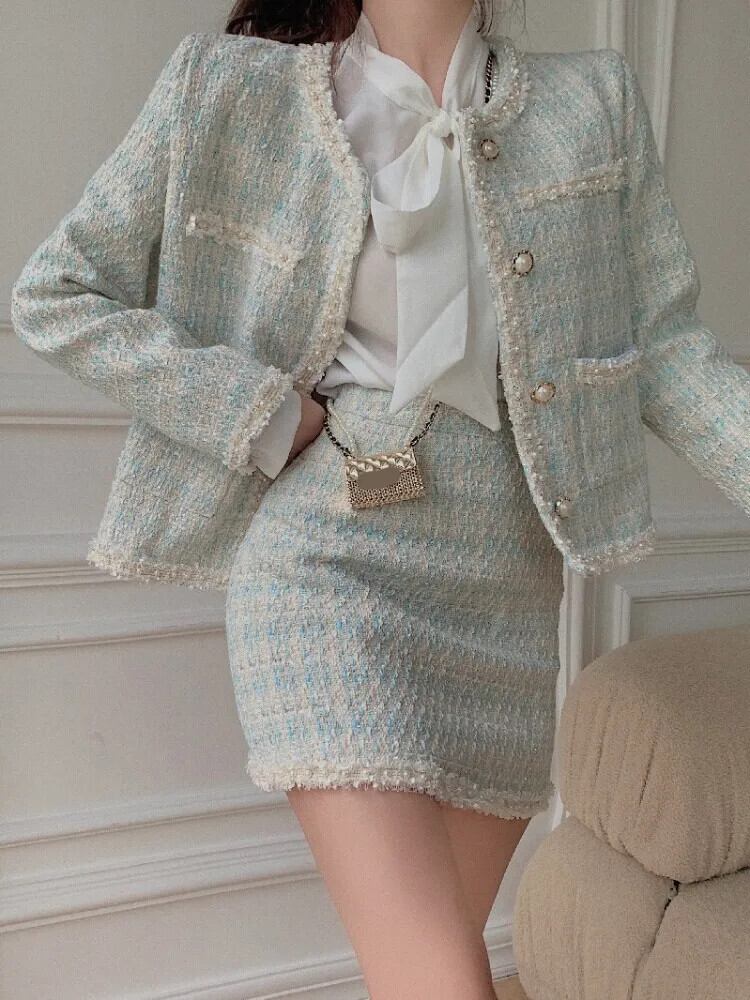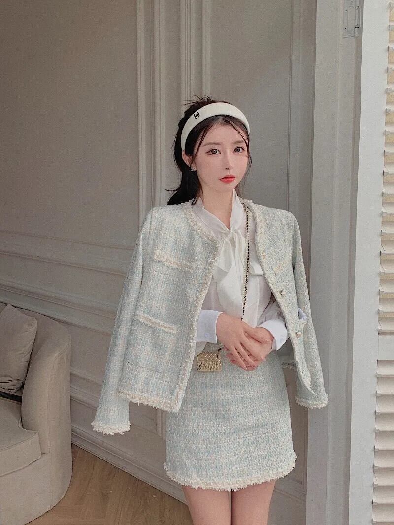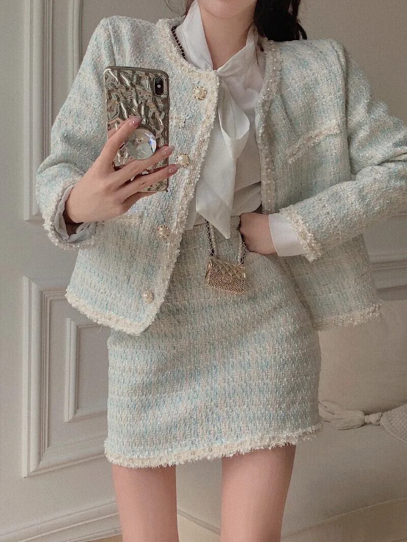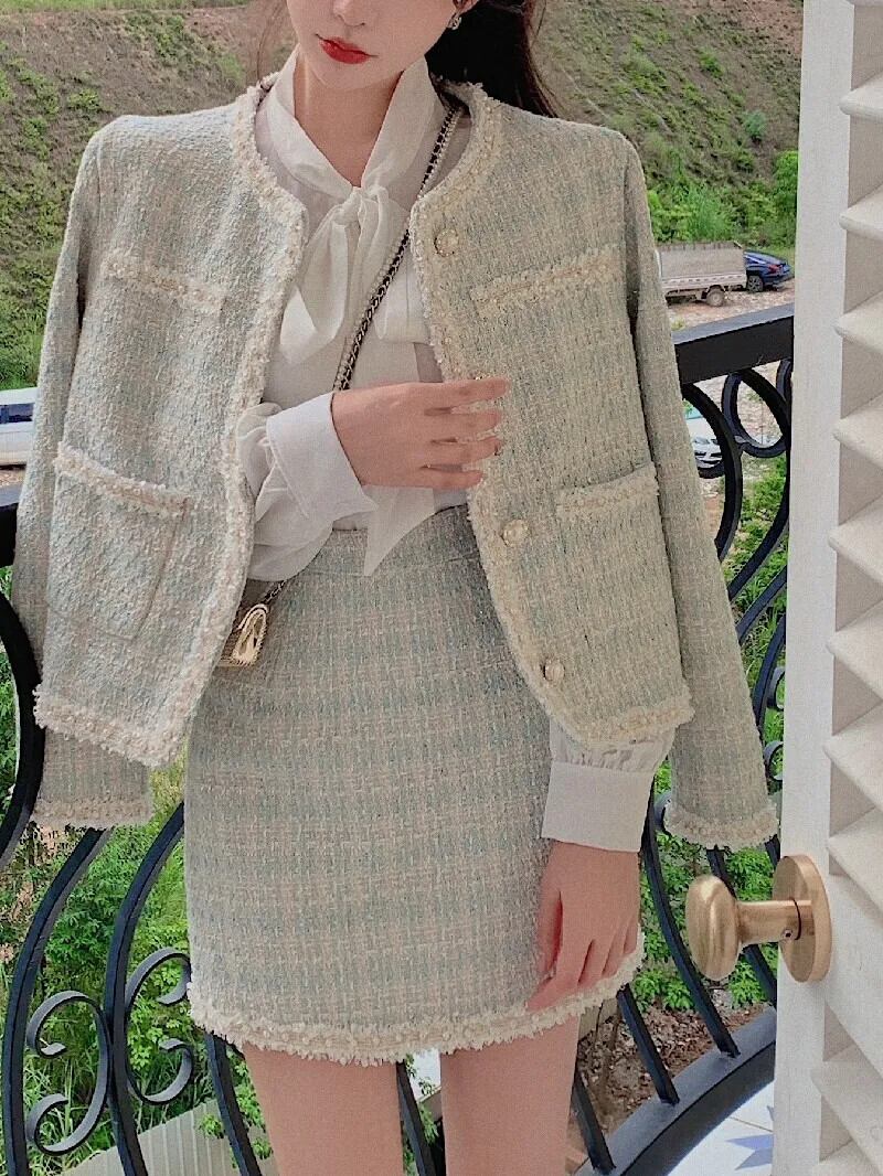 甘いホットガールミントグリーンツイードスーツ秋長袖 O ネックコートウエストミニスカート 2 点セット ロング 大人ガーリー スウィート キュート カジュアル オータム 秋物 Oネック