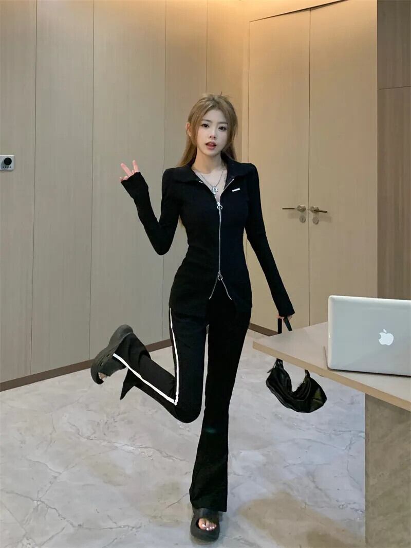 ホットガールスポーツスーツ秋黒長袖カーディガントップスプリットフレアパンツツーピースセット ロング ブラック オータム 秋物