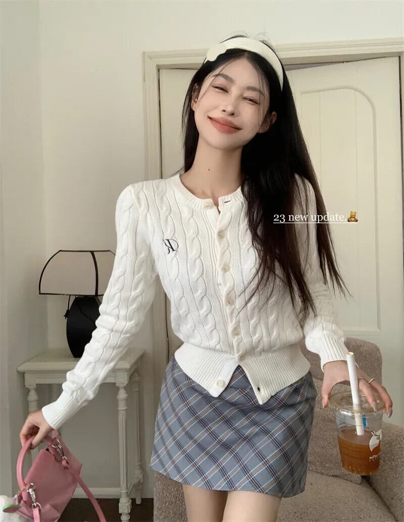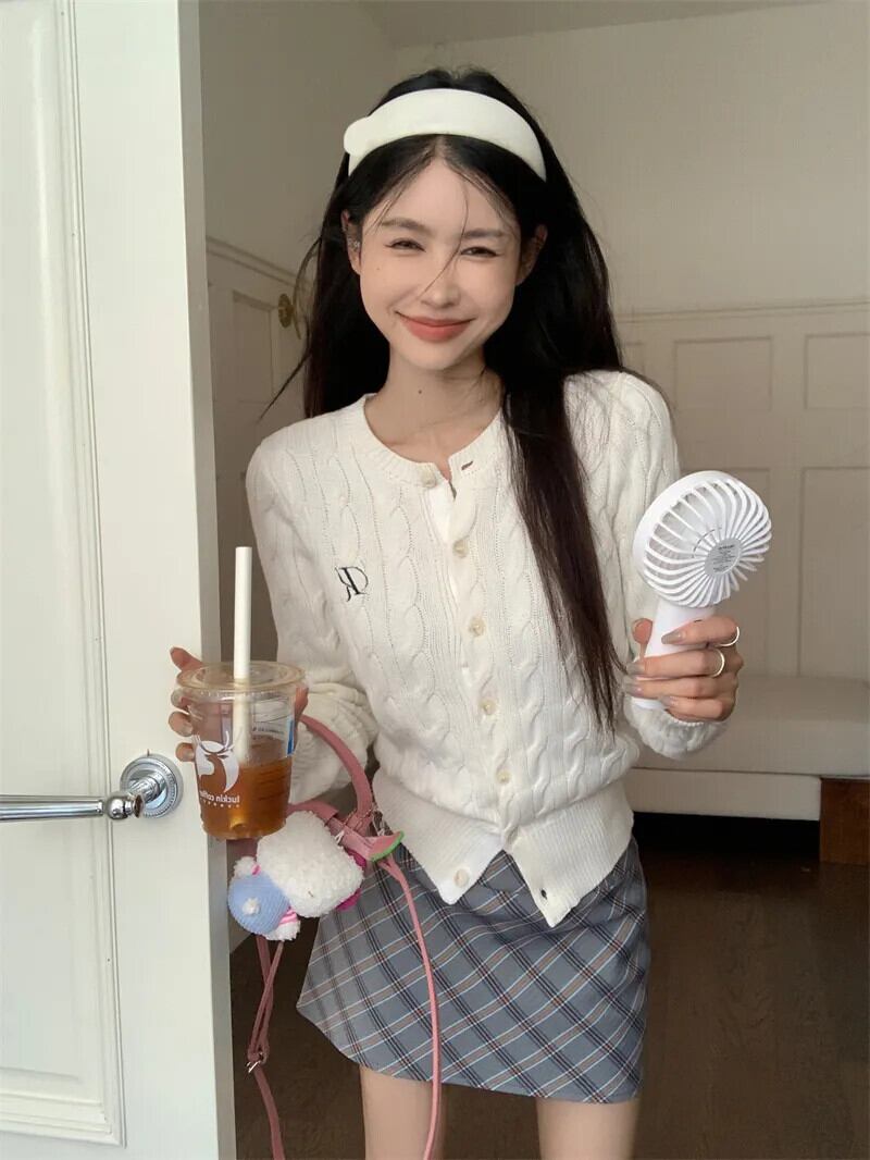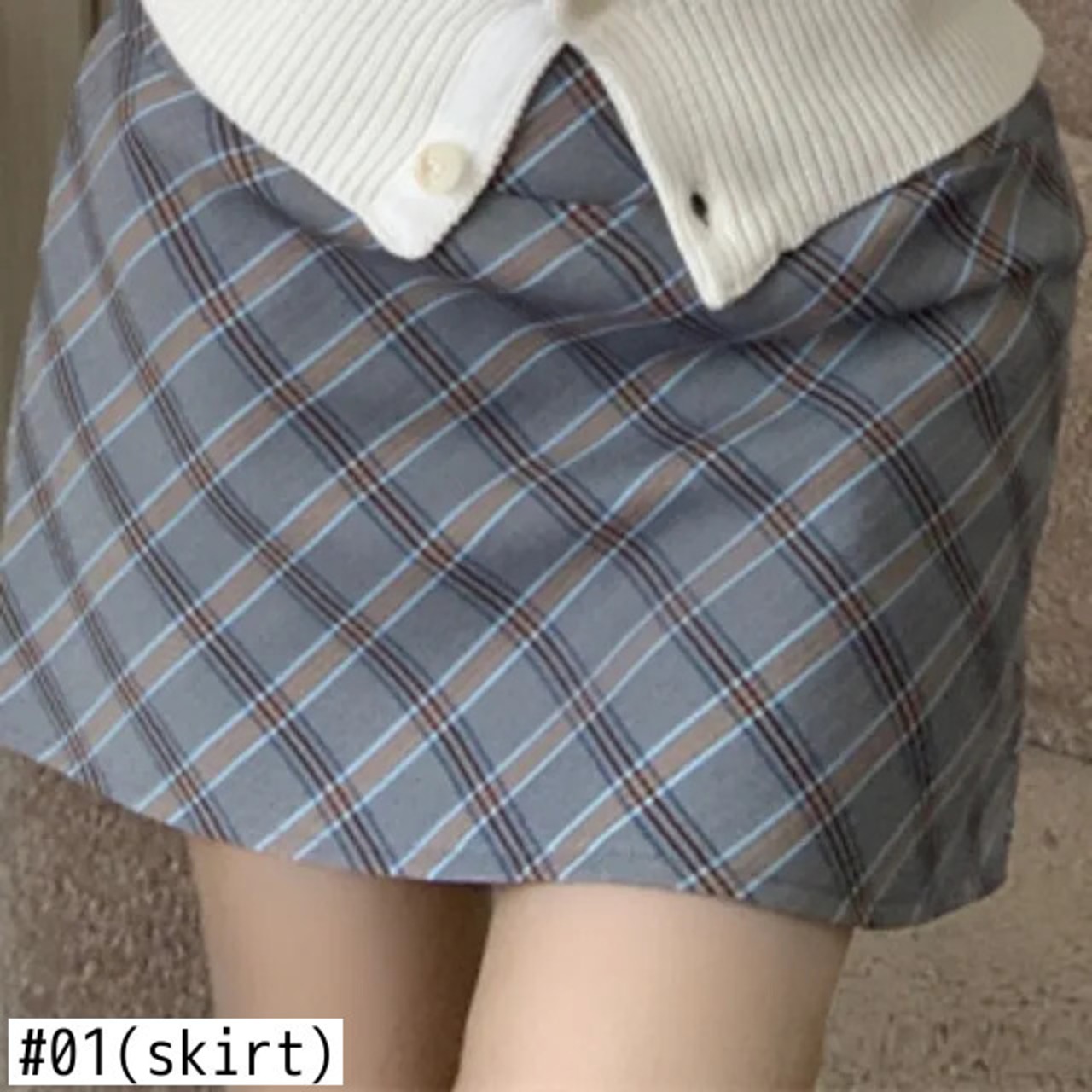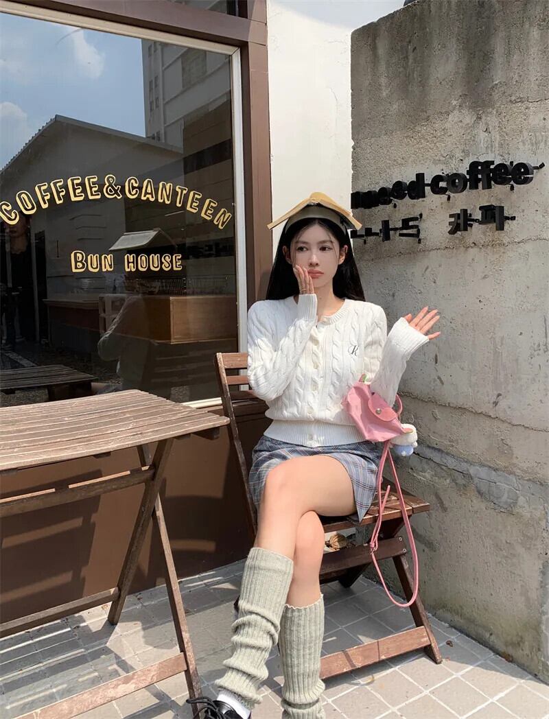 ホットガールスタイルスーツ秋刺繍ニットカーディガンチェックミニスカートツーピースセット レッド オータム 秋物