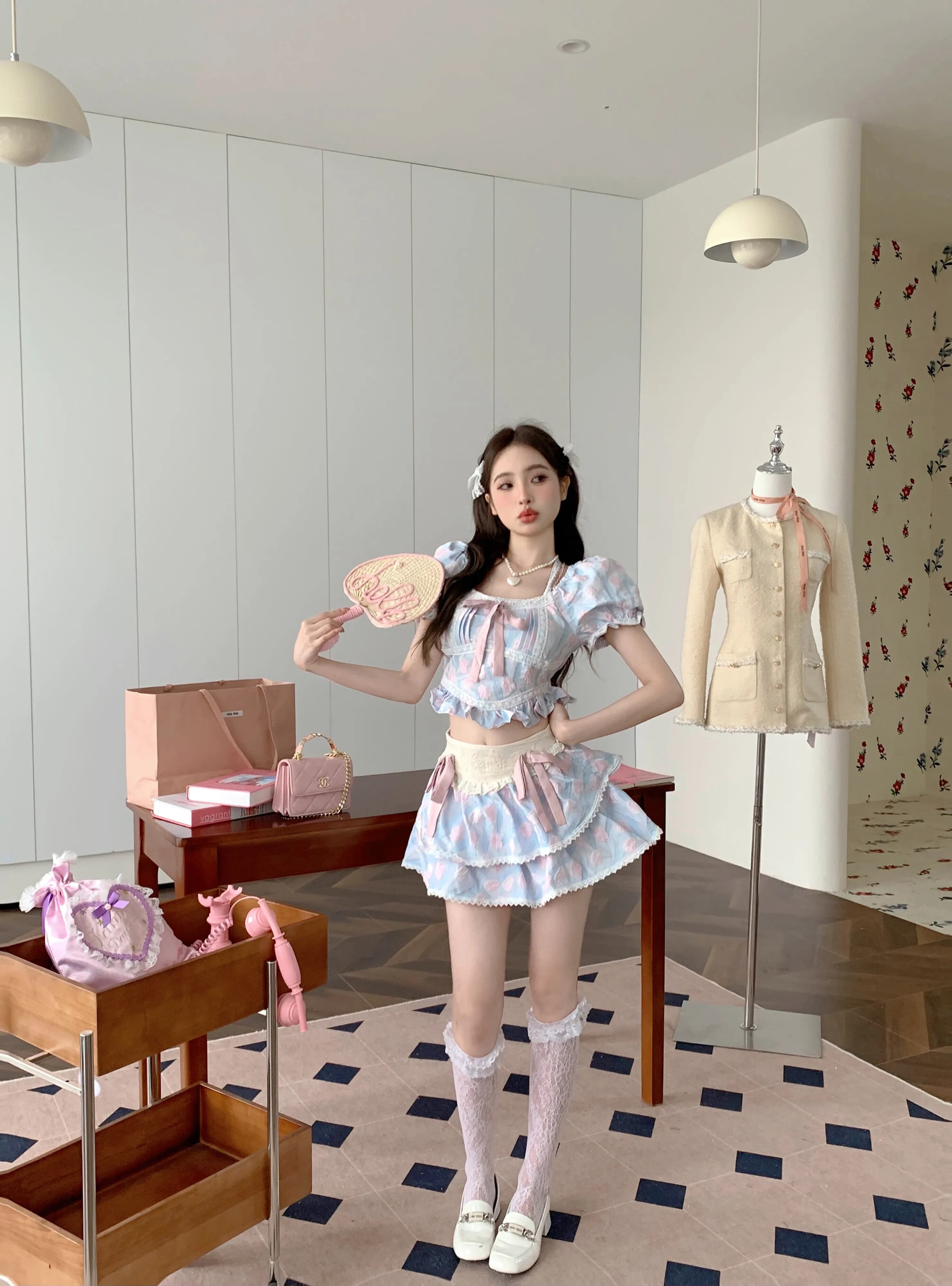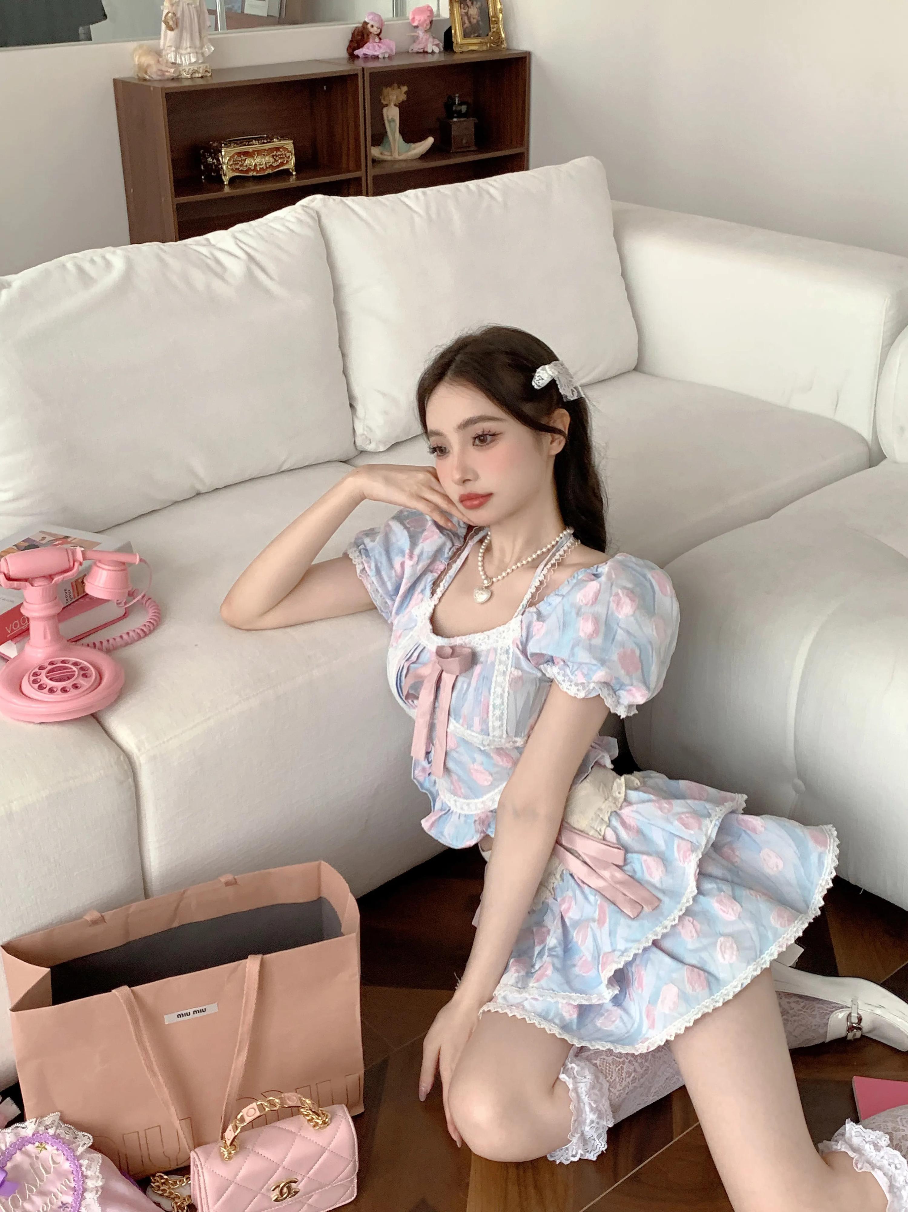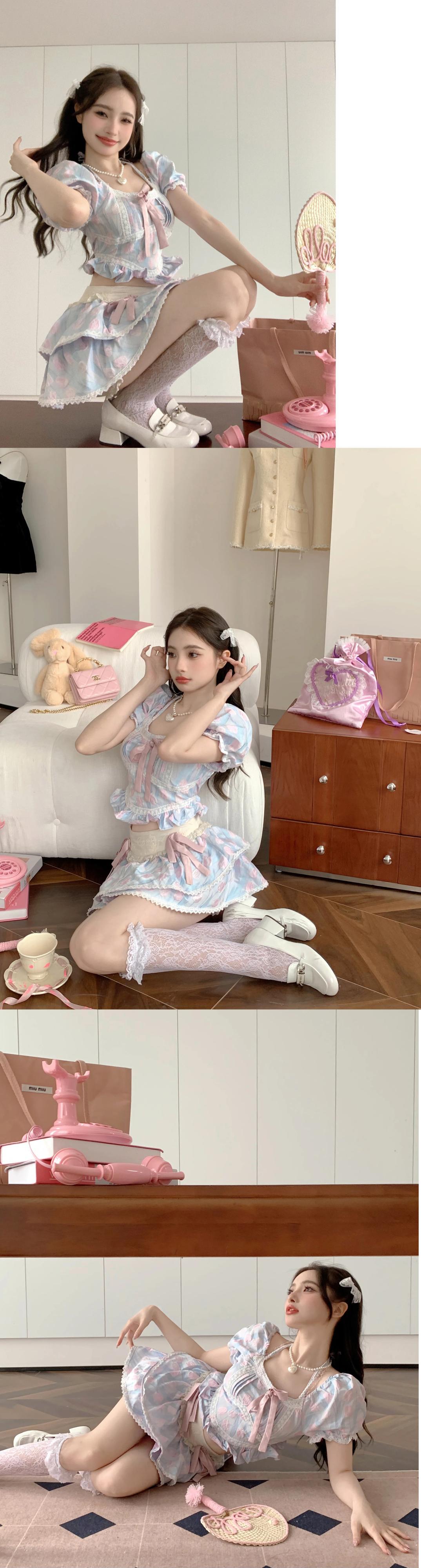 スイートホットガールスーツ夏半袖シャツトップウエスト A ラインミニスカート 2 点セット 大人ガーリー スウィート キュート カジュアル サマー 夏物 Aライン