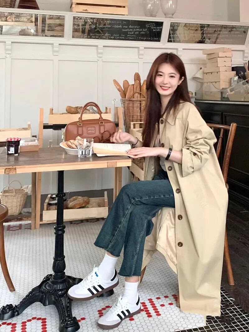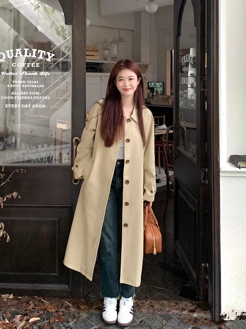 ホットガール通勤スタイルカーキトレンチコート秋ルーズフィットミッドレングスコート オータム 秋物