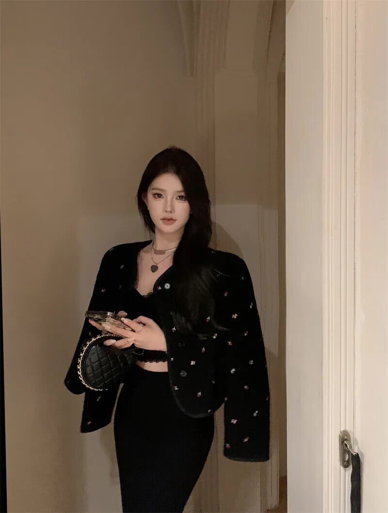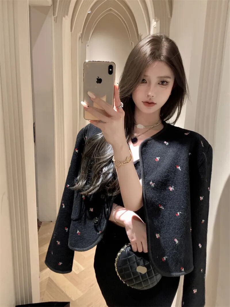 フレンチスタイル甘いホットガール O ネックコート秋/冬刺繍ウール長袖ショートカーディガントップ ロング 大人ガーリー スウィート キュート カジュアル オータム 秋物 ウィンター 冬物 Oネック