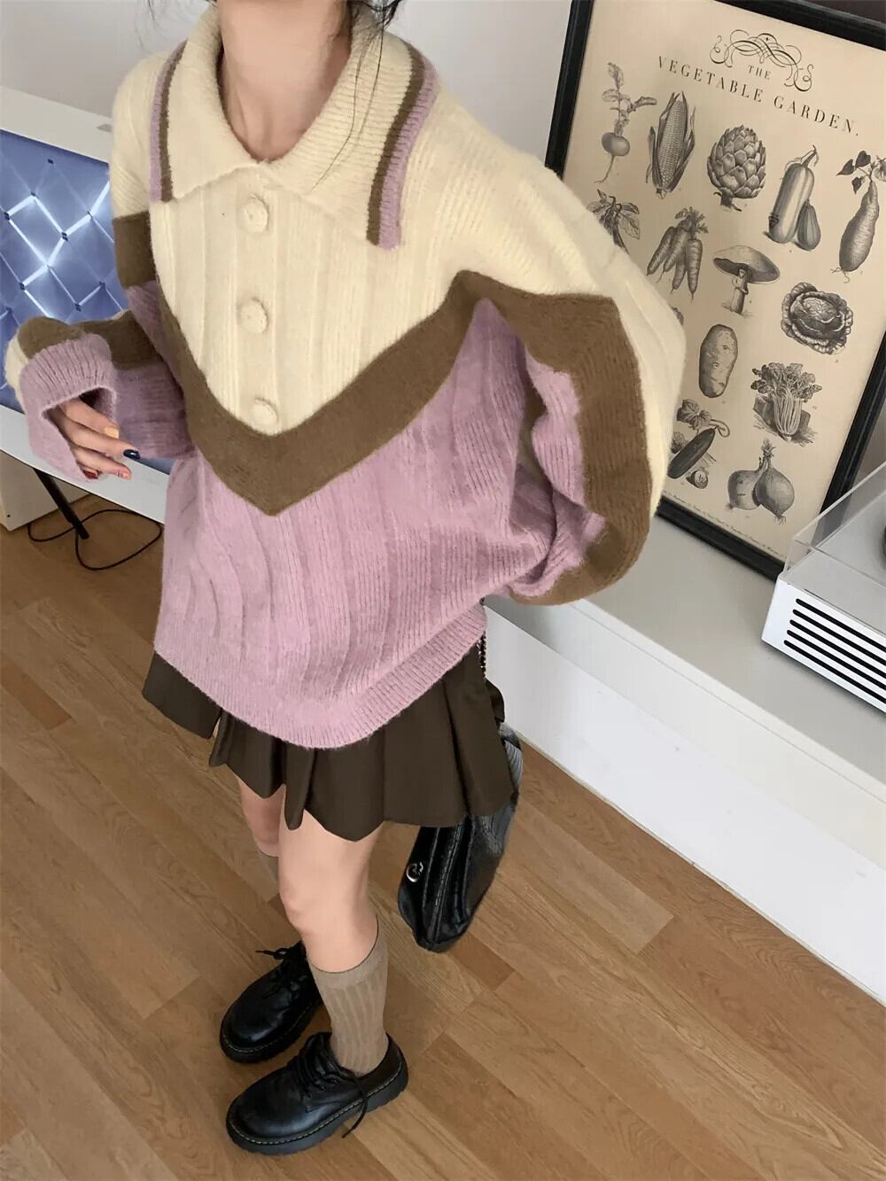 スタイル甘いホットガールターンダウン襟セーター長袖ルーズニットプルオーバートップ ロング 大人ガーリー スウィート キュート カジュアル