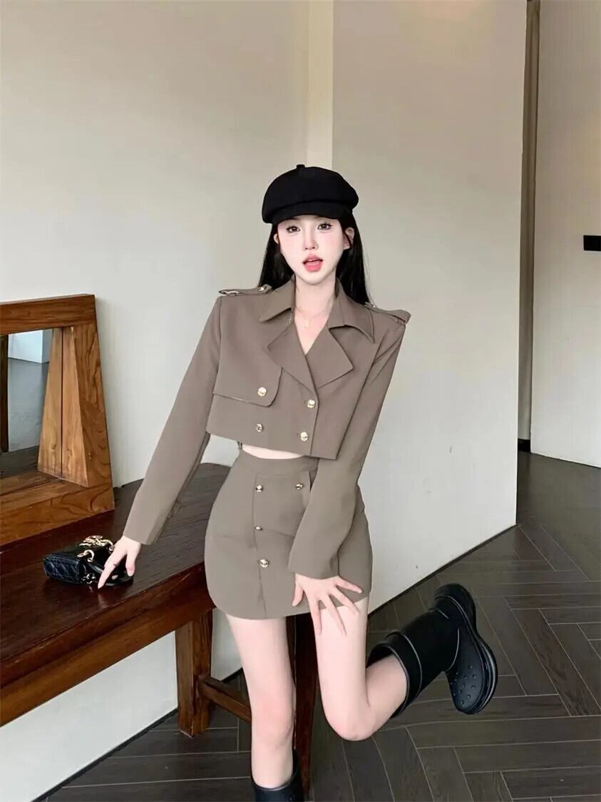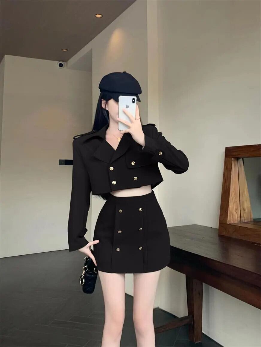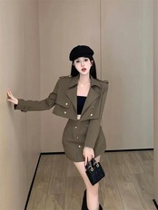 純粋セクシースタイルホットガールスーツ秋ダブルブレストジャケットウエストスカートツーピースセット オータム 秋物 ピュア