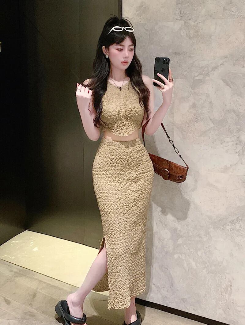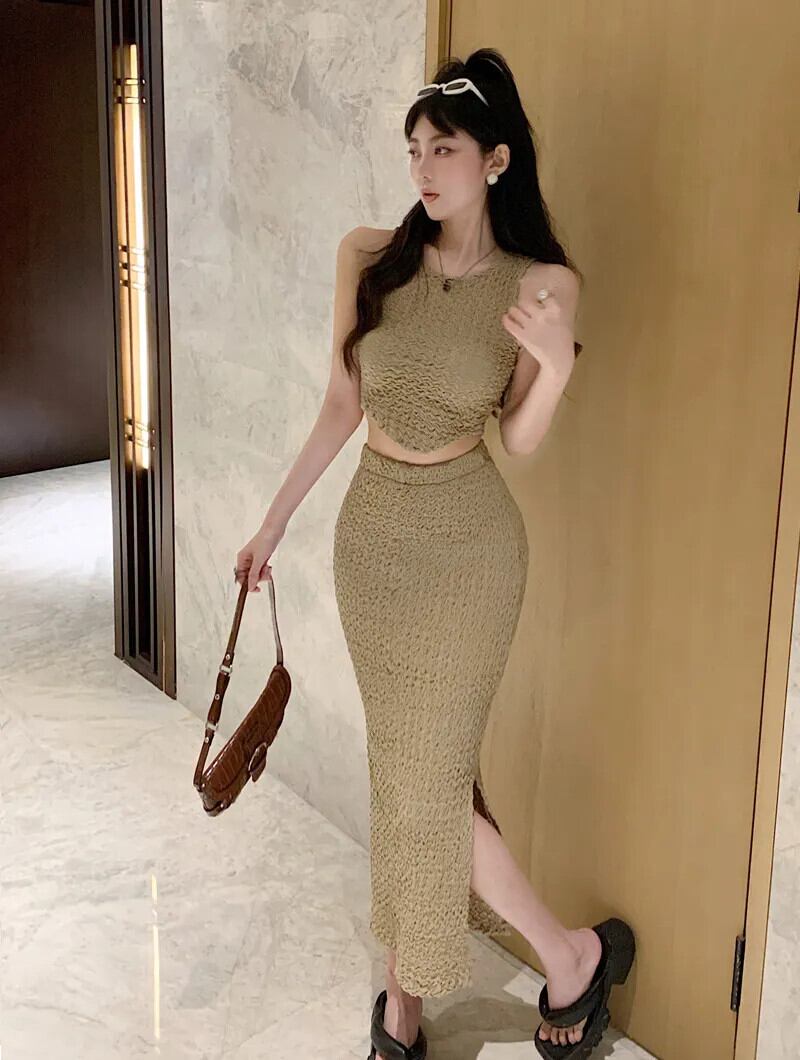 フレンチホットガールスーツ秋ストレッチタンクトップウエストラップヒップスプリットロングスカートツーピースセット オータム 秋物
