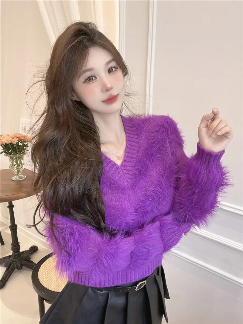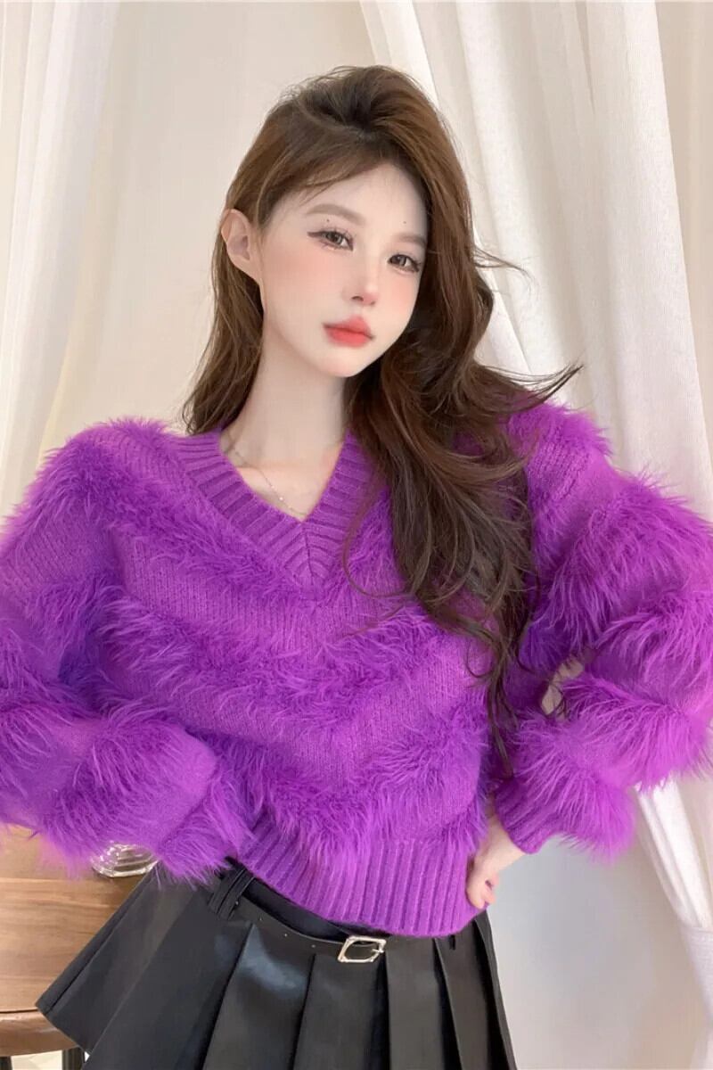 スタイル甘いホットガール肥厚ミンクフリース V ネックセーター冬スプライススリーブニットプルオーバー 大人ガーリー スウィート キュート カジュアル ウィンター 冬物 Vネック