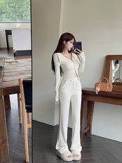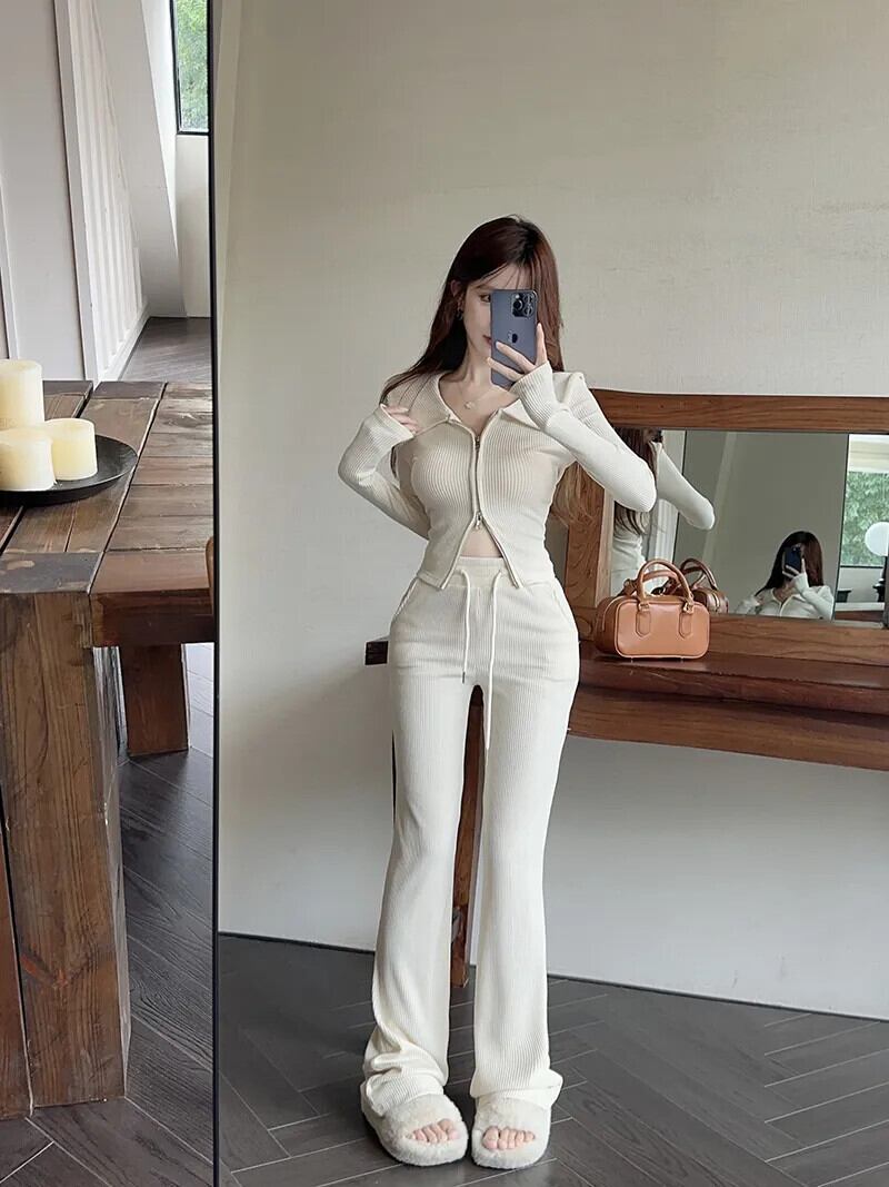 スイートホットガールスーツ レディース 秋ジッパー ターンダウンカラー ショート スリムフィット トップ ウエスト ワイドレッグ パンツ 2 点セット 大人ガーリー スウィート キュート カジュアル オータム 秋物 ワイドパンツ