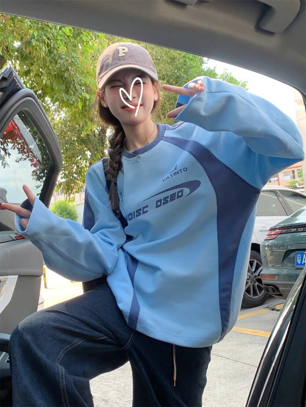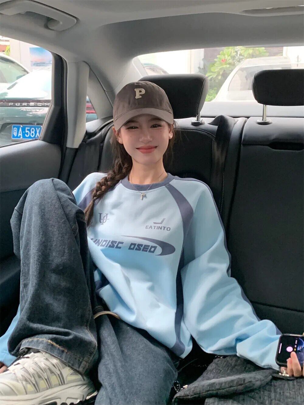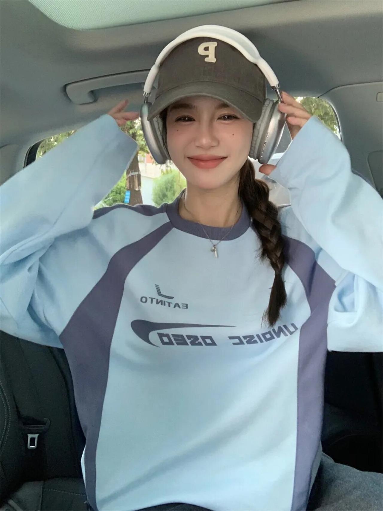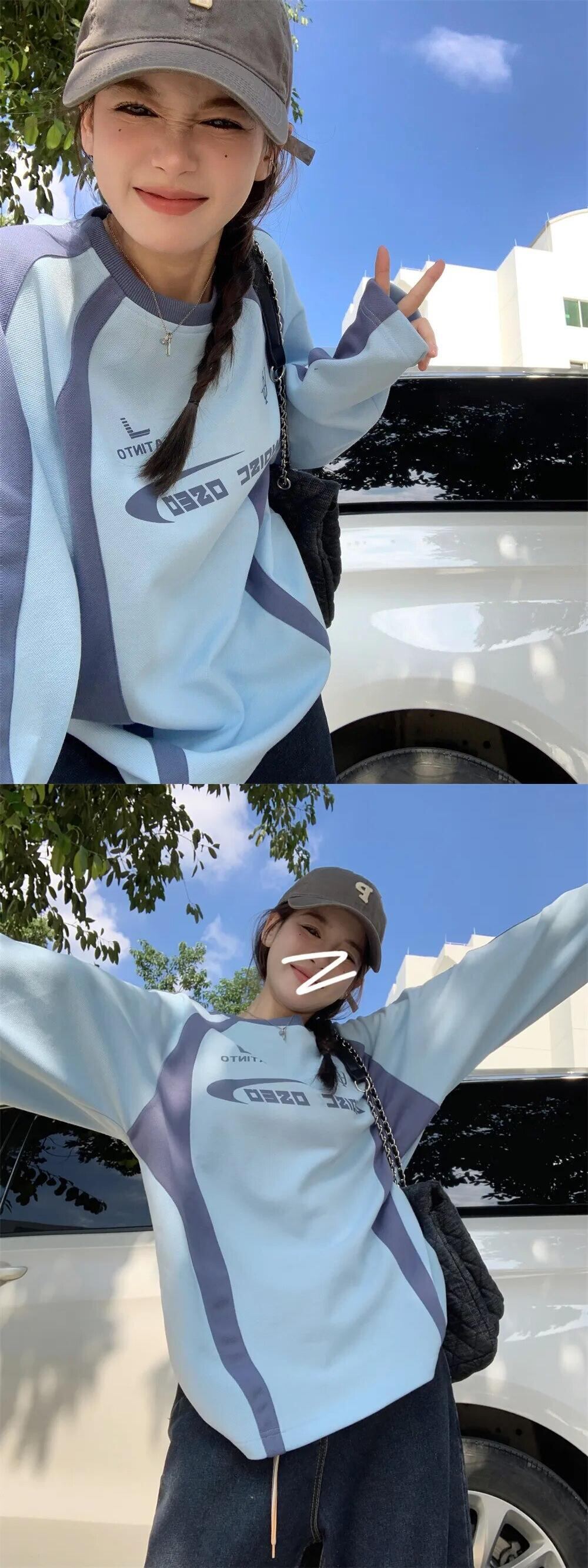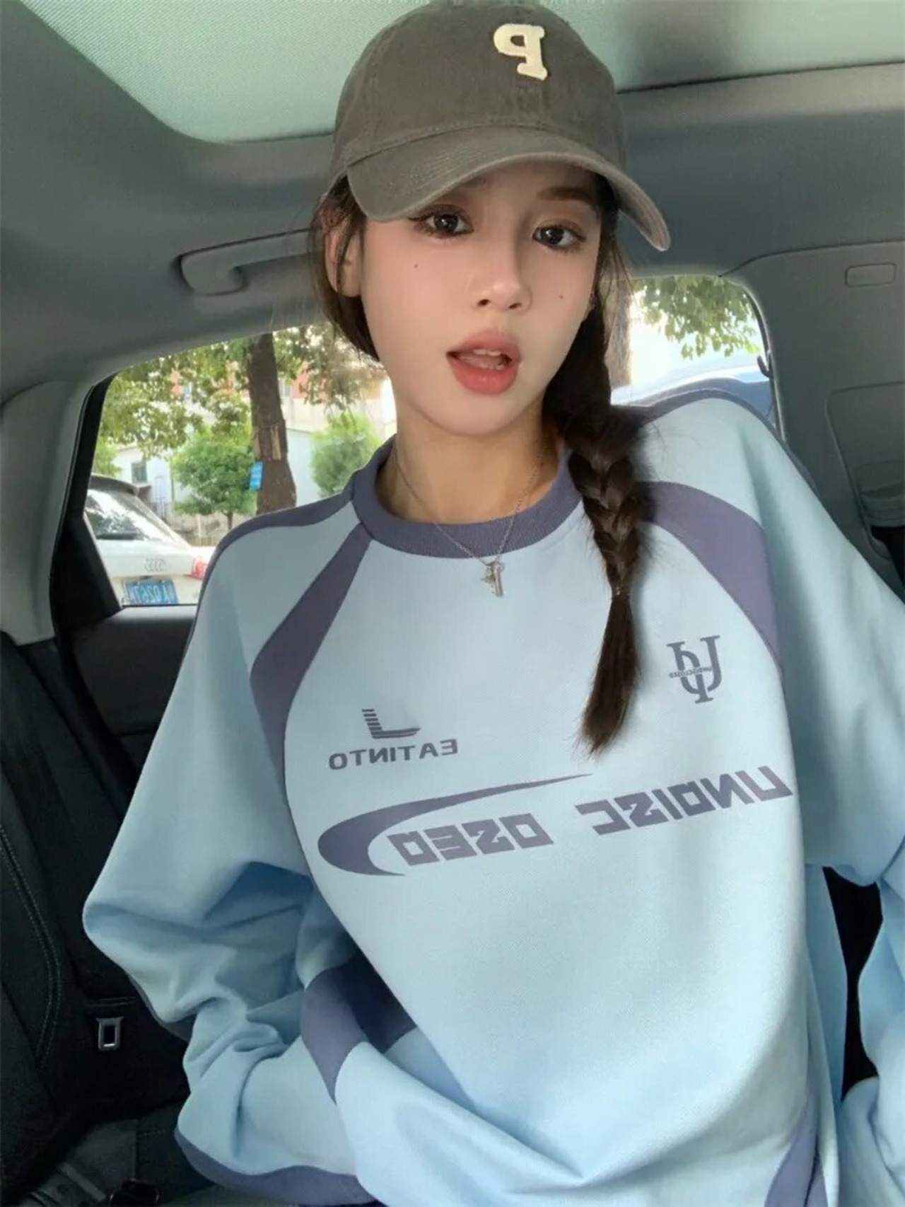 アメリカンホットガールレトロレタープリントコントラストカラー長袖セーター秋ルーズフィットミディアム丈トップ ロング オータム 秋物