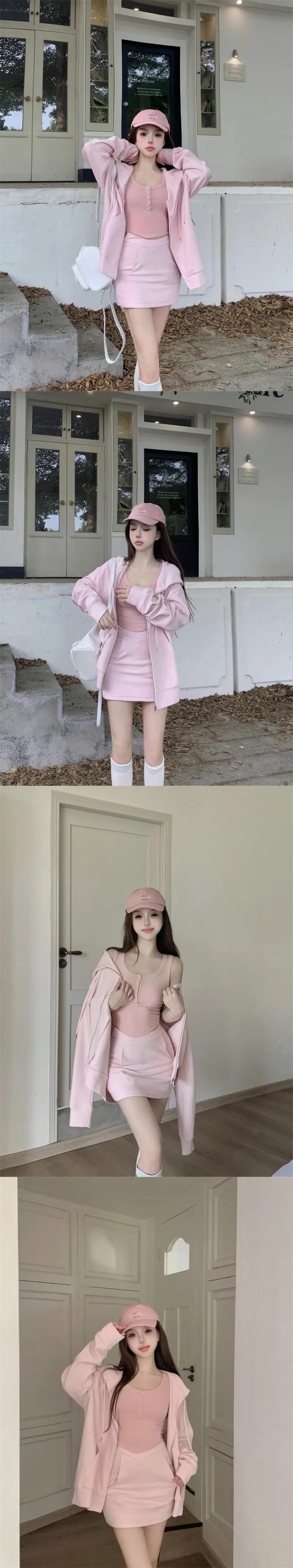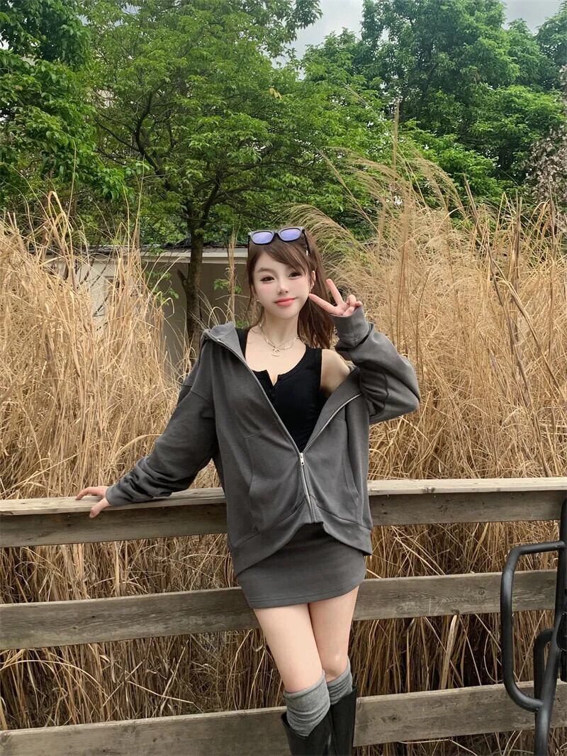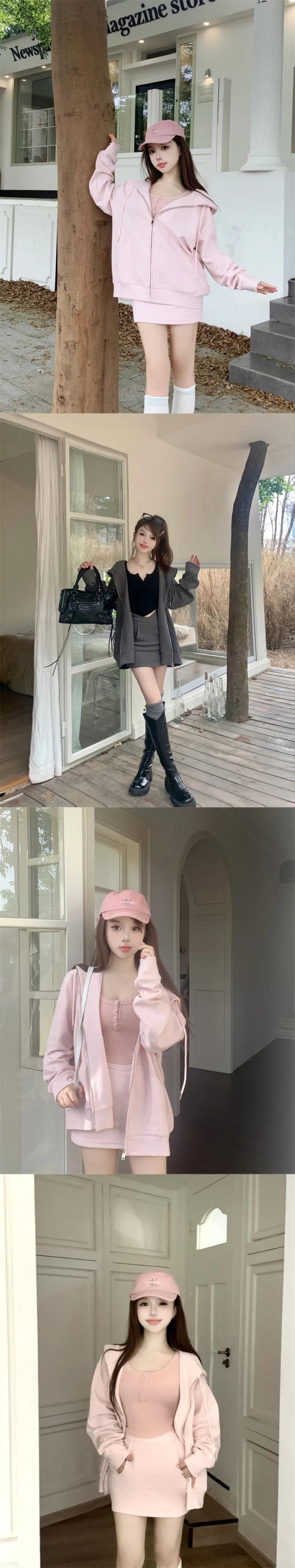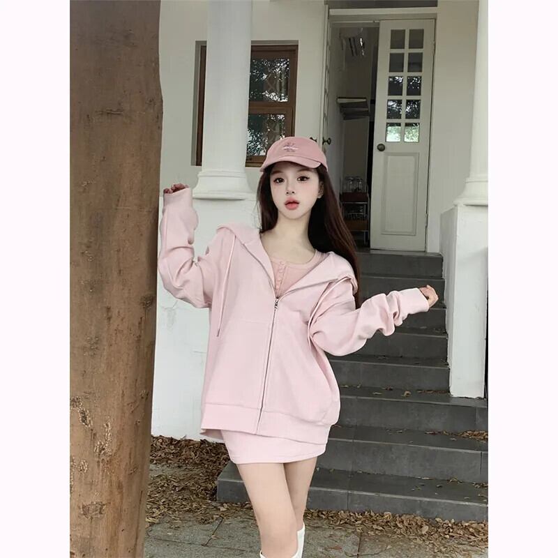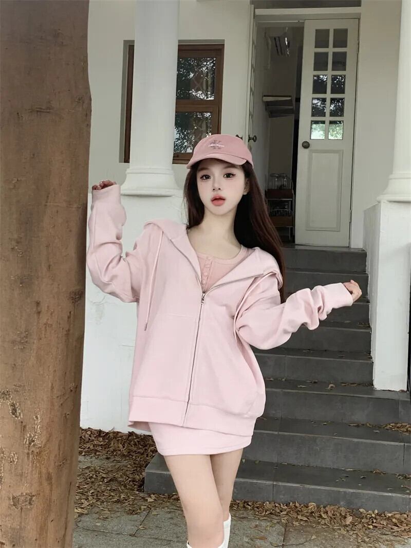 ピンクスウィートガールスーツ秋フード付きスウェットシャツコートラップヒップショートスカートツーピースセット 大人ガーリー キュート カジュアル オータム 秋物