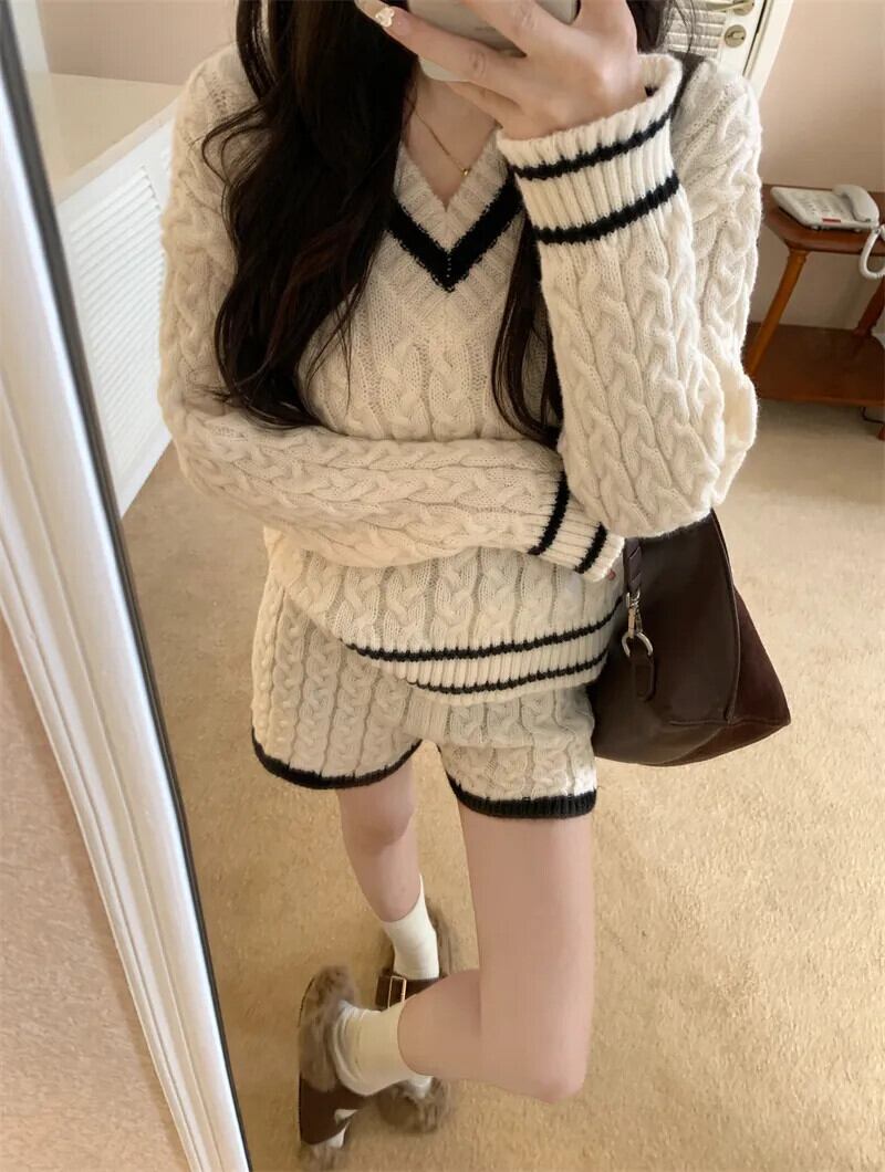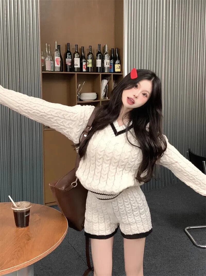 Sweet Girl コントラストニットスーツ秋ルーズ V ネックセーターウエストショーツ 2 点セット 大人ガーリー スウィート キュート カジュアル オータム 秋物 ブルマー Vネック