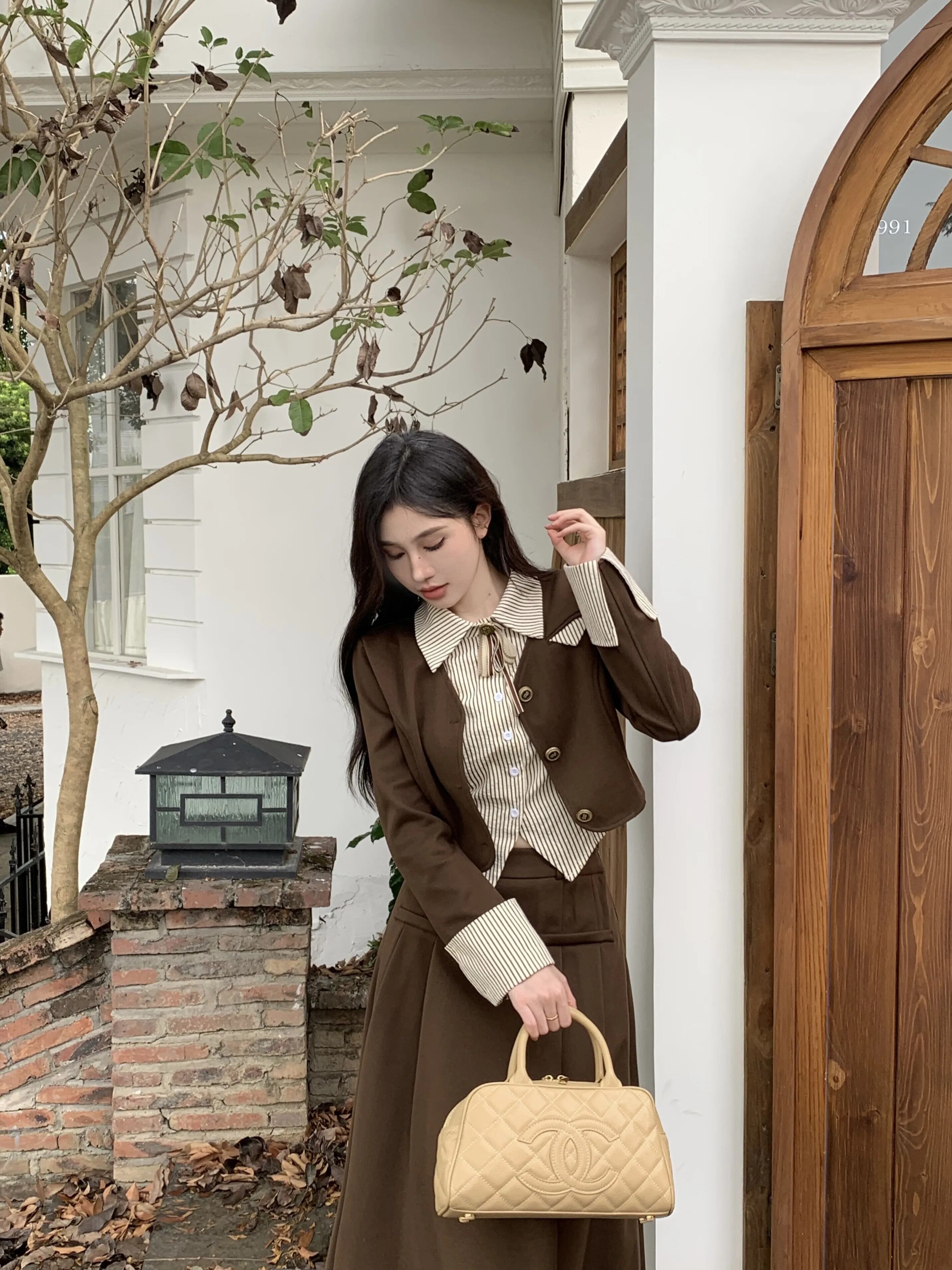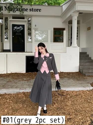 香港スタイルレトロスタイルスーツ秋パッチワークトッププリーツロングスカートツーピースセット オータム 秋物