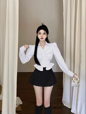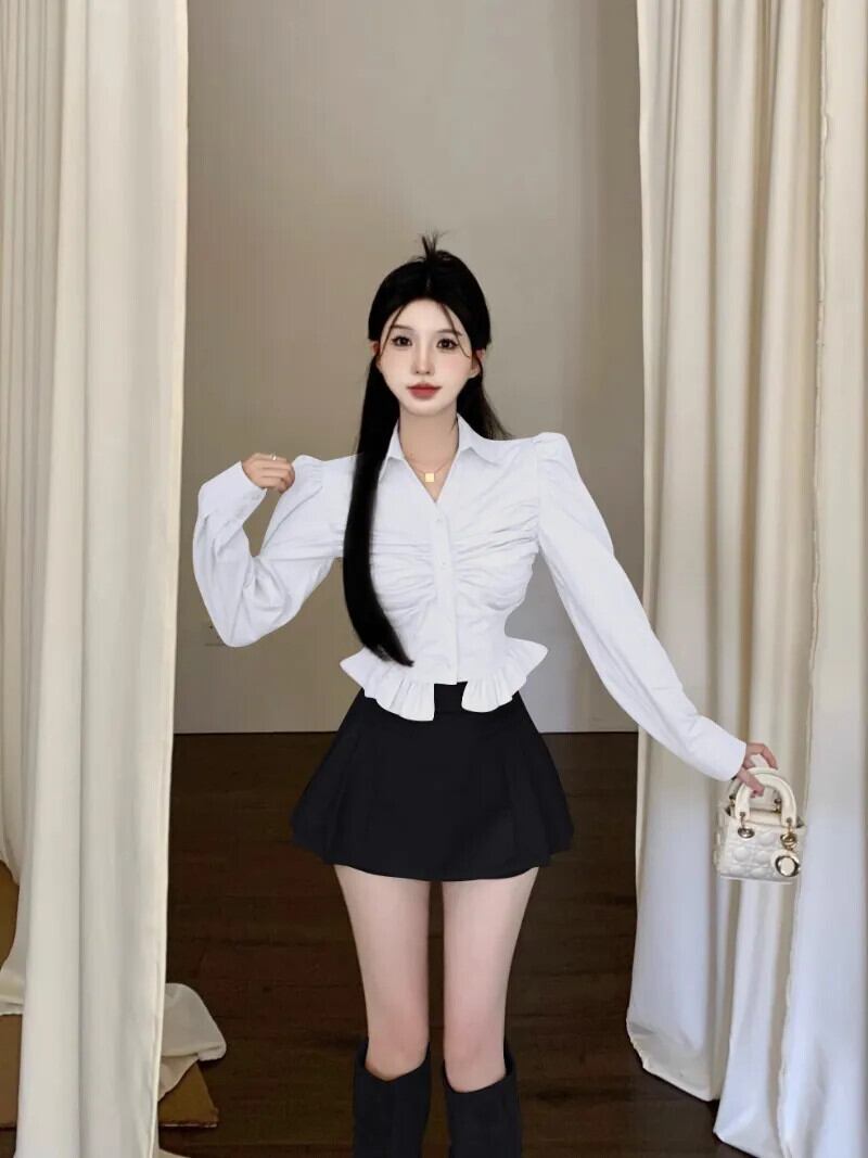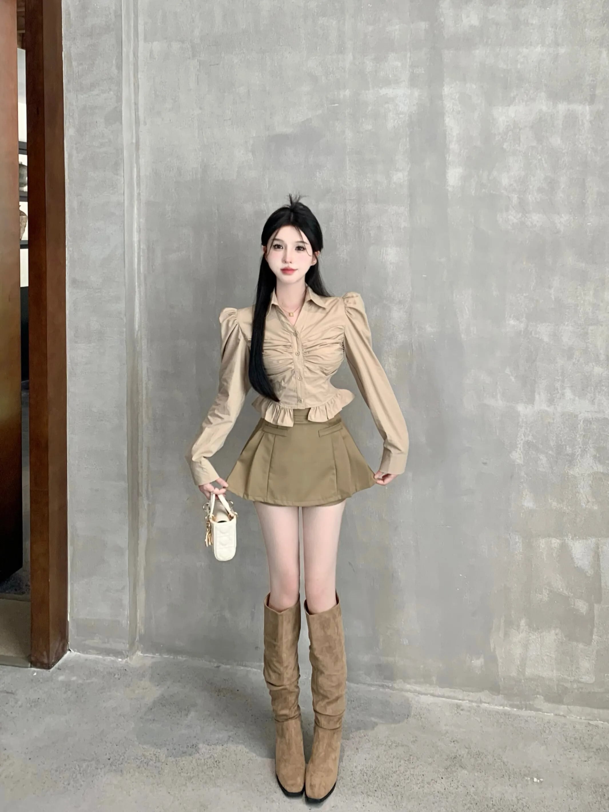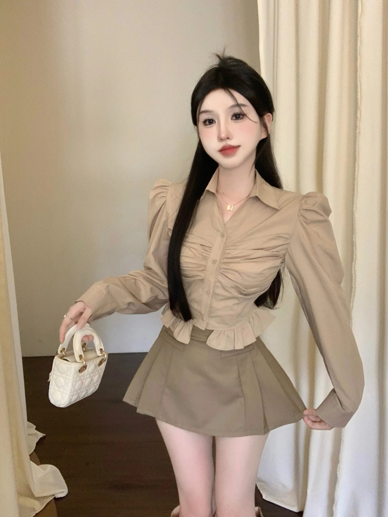 甘くてクールホットガールスーツ秋フリル長袖シャツウエスト A ラインミニスカート 2 点セット ロング 大人ガーリー スウィート キュート カジュアル オータム 秋物 Aライン