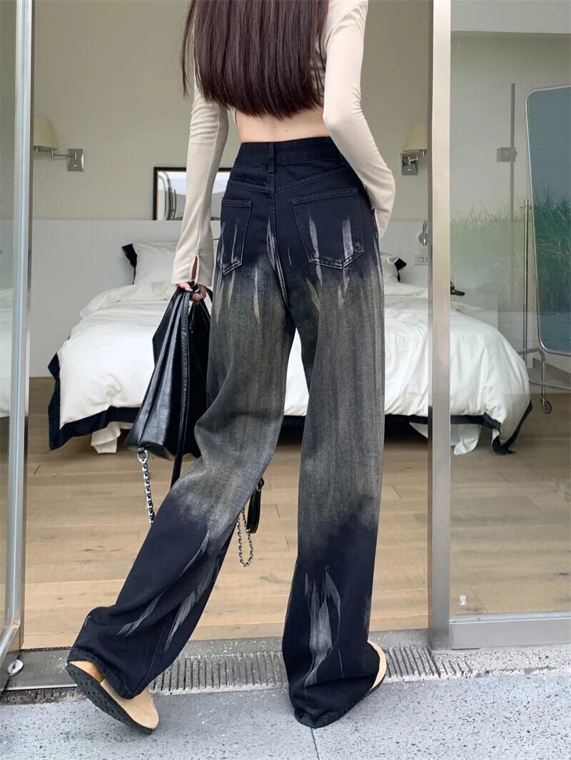 甘いホットガールグラデーションウエストワイドレッグジーンズ秋多用途床ドラッグ長ズボン ロング 大人ガーリー スウィート キュート カジュアル オータム 秋物 ワイドパンツ