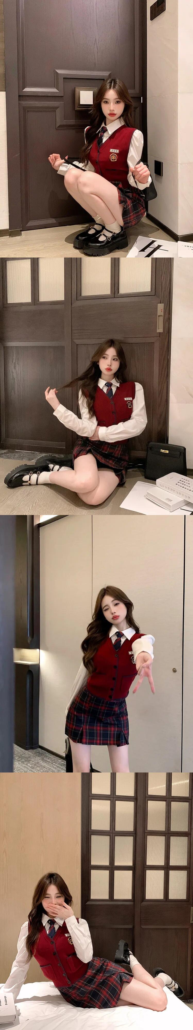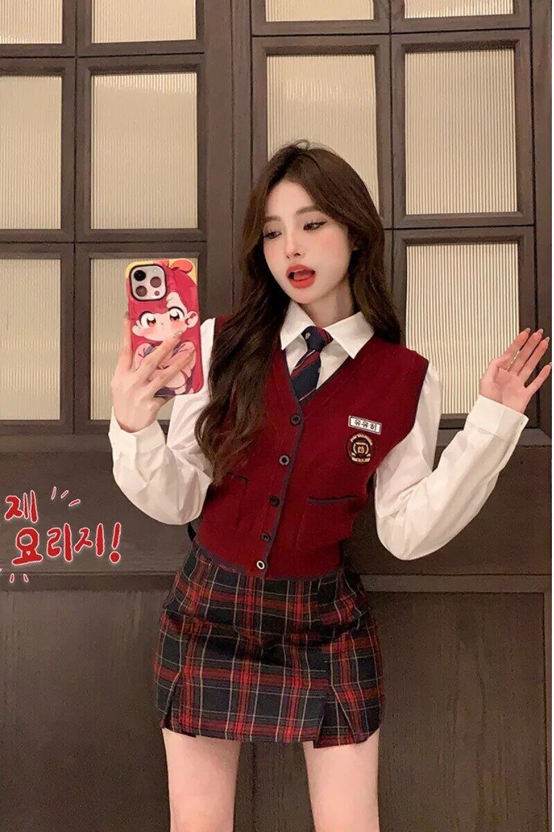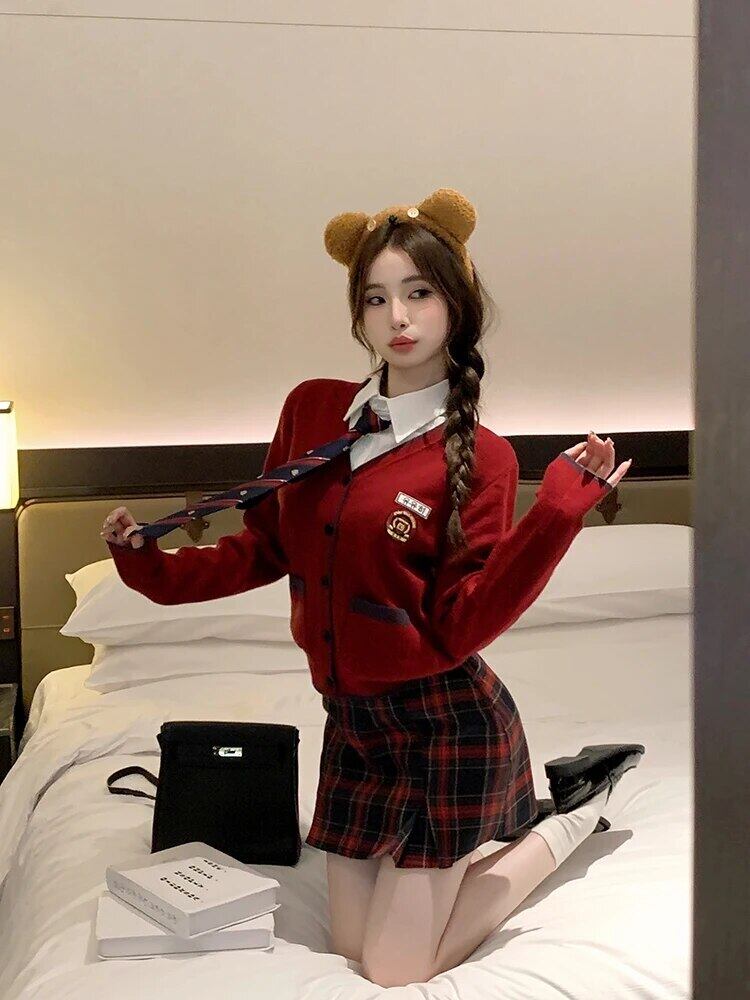 プレッピースタイルスーツ レディース 秋 赤 ニットカーディガン タンクトップ 長袖シャツ チェック柄 ミニスカート 3点セット ロング レッド オータム 秋物