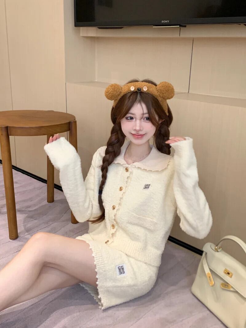 甘いホットガールスーツ秋ターンダウン襟ニットコートウエストラップヒップミニスカートツーピースセット 大人ガーリー スウィート キュート カジュアル オータム 秋物