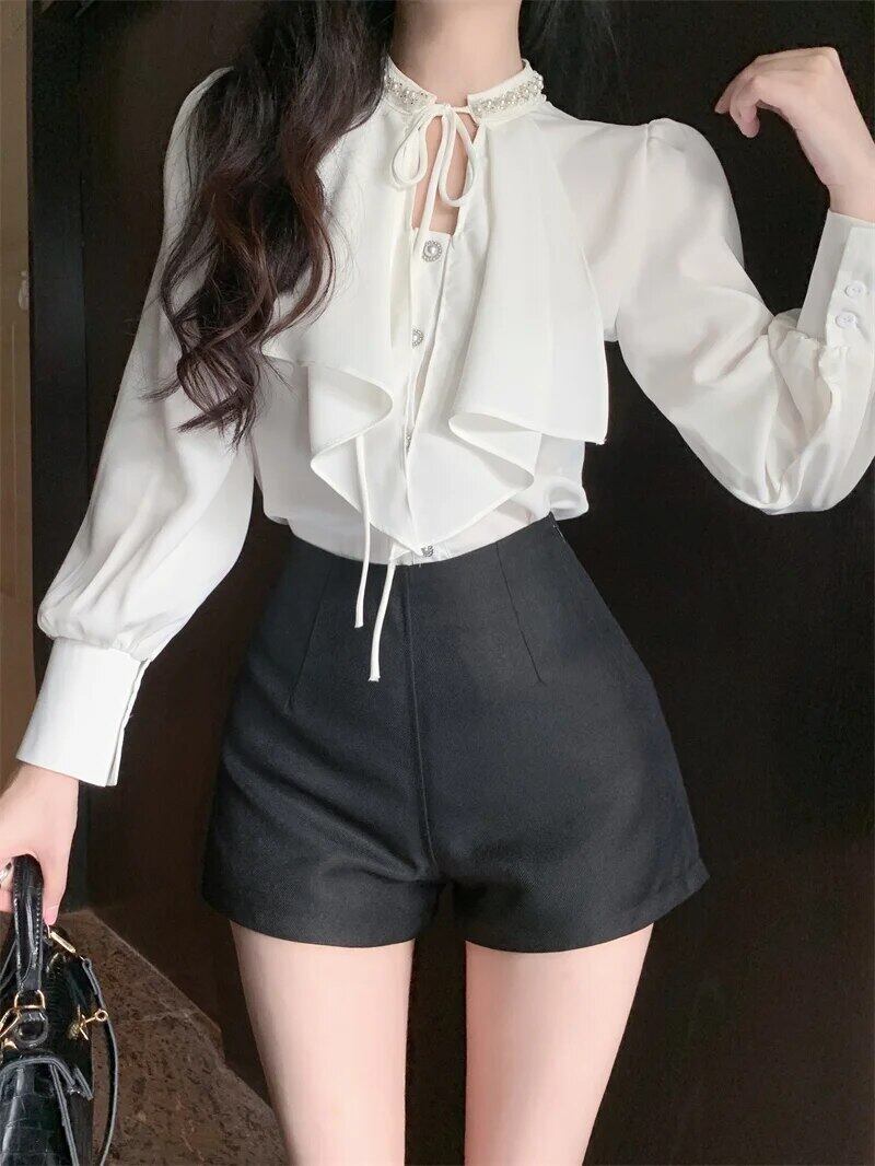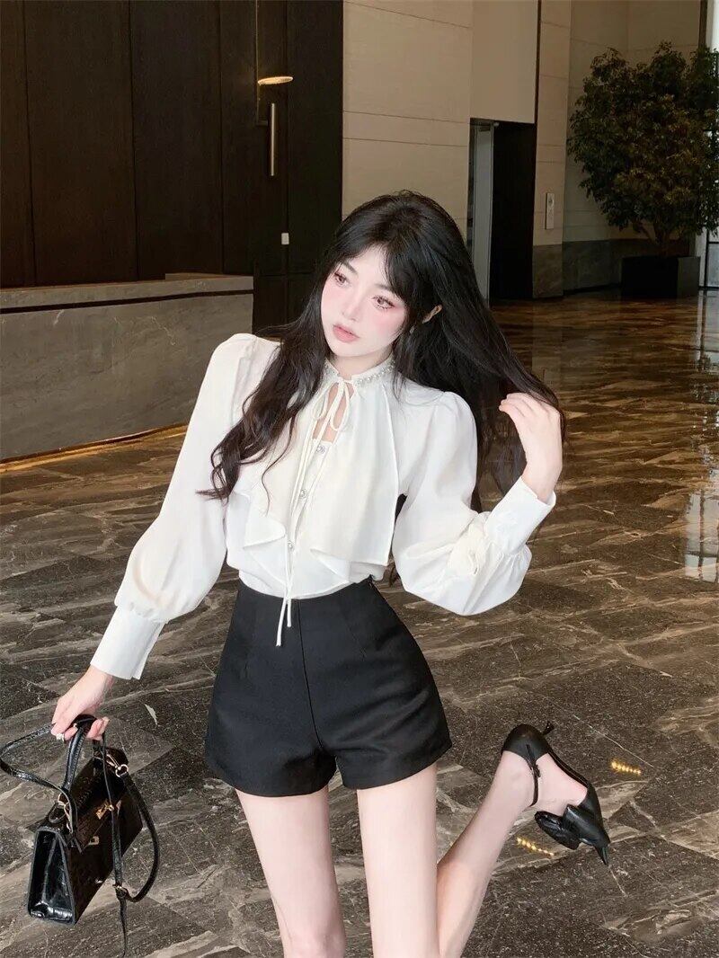 甘いホットガールスーツ秋長袖フリル白シャツ黒ウエストショーツ 2 点セット ロング ホワイト ブラック ラッフル 大人ガーリー スウィート キュート カジュアル オータム 秋物 ブルマー