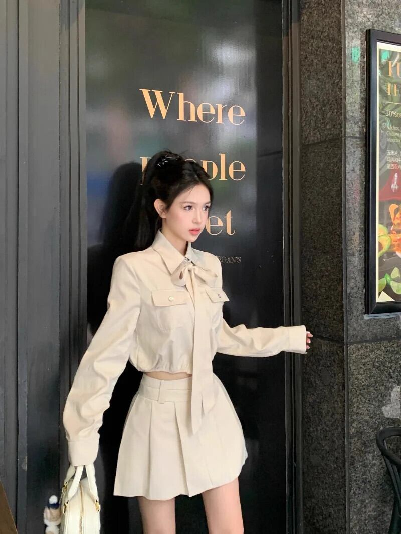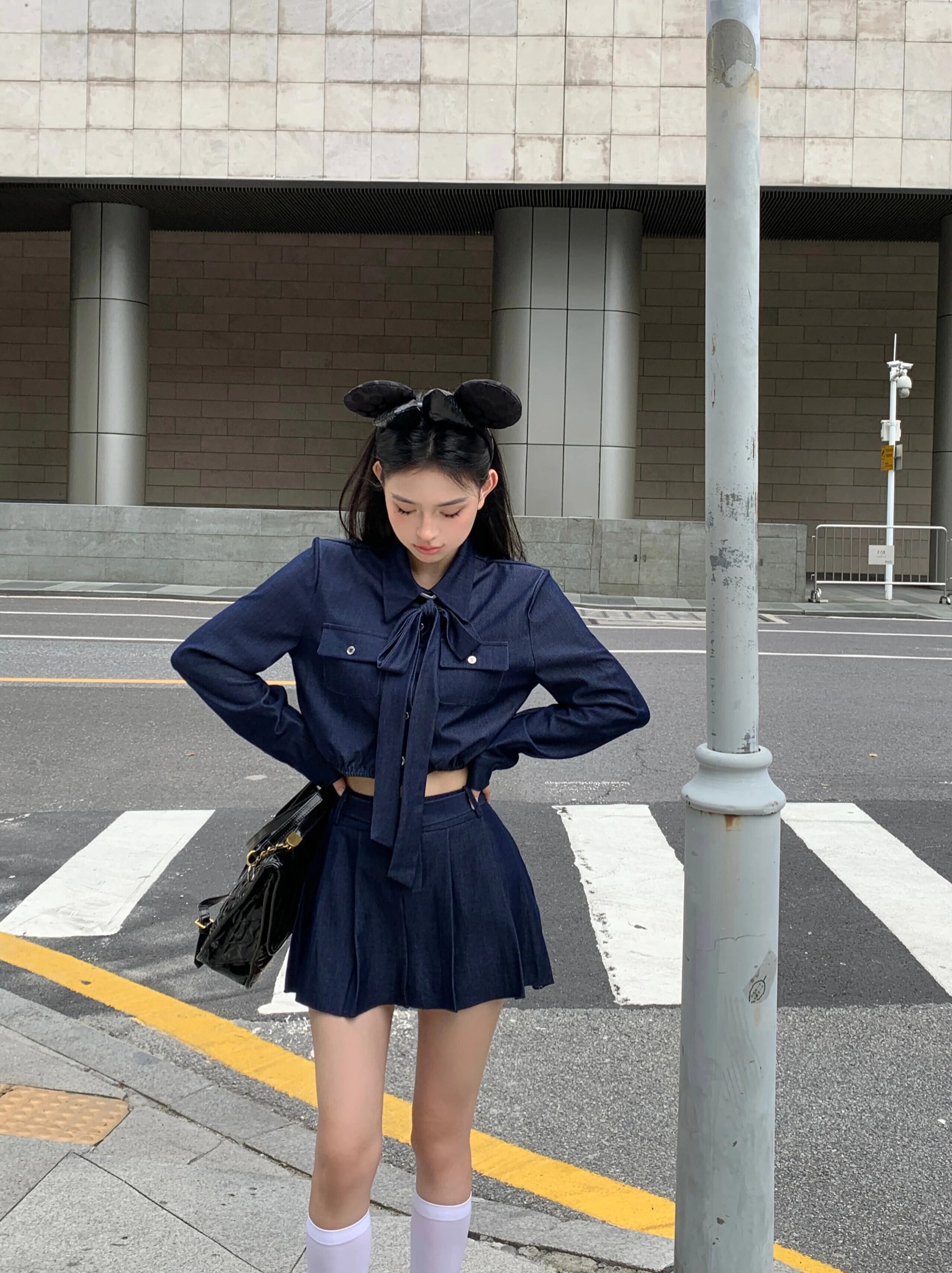 スイートガールスーツ秋リボンブラウストップ無地プリーツウエストショートスカートツーピースセット 大人ガーリー スウィート キュート カジュアル オータム 秋物 ソリッドカラー