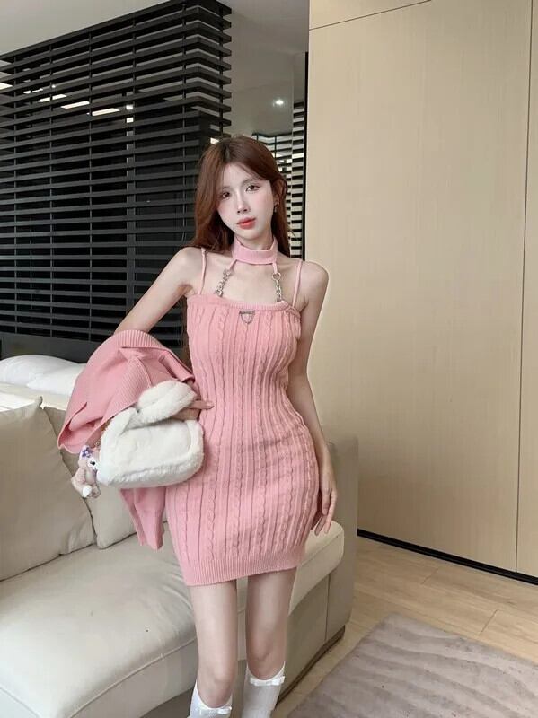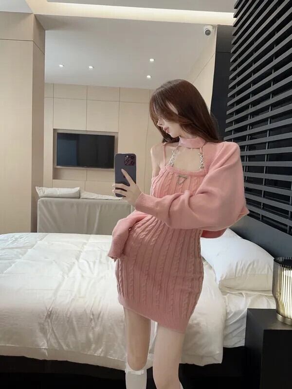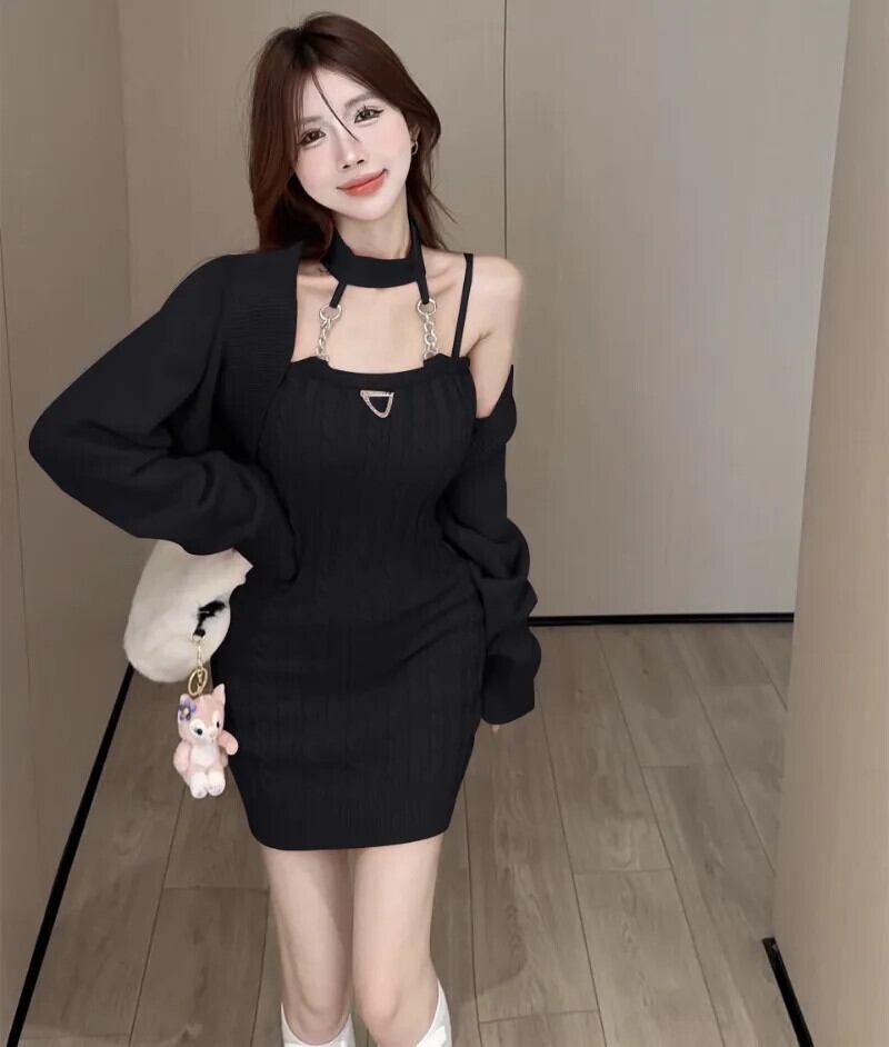 Sweet Girl 純粋セクシースーツ秋長袖カーディガンホルターストラップスリムフィットドレスツーピースセット ロング 大人ガーリー スウィート キュート カジュアル オータム 秋物 ピュア