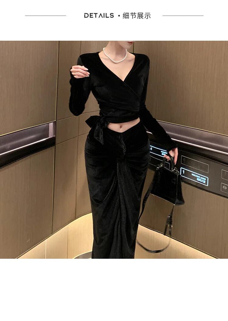 スイートガールスーツ レディース 秋/冬 オープンウエスト ベルベット スリムフィット ショートトップ ミッドレングス スプリットロングスカート 2点セット 大人ガーリー スウィート キュート カジュアル オータム 秋物 ウィンター 冬物