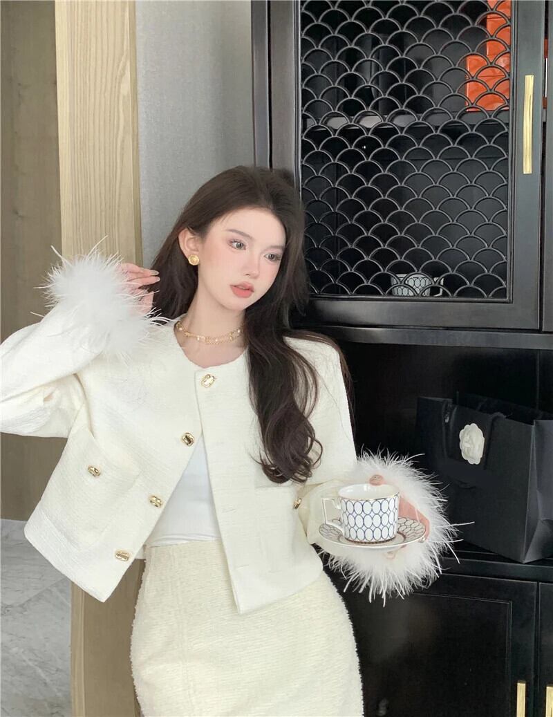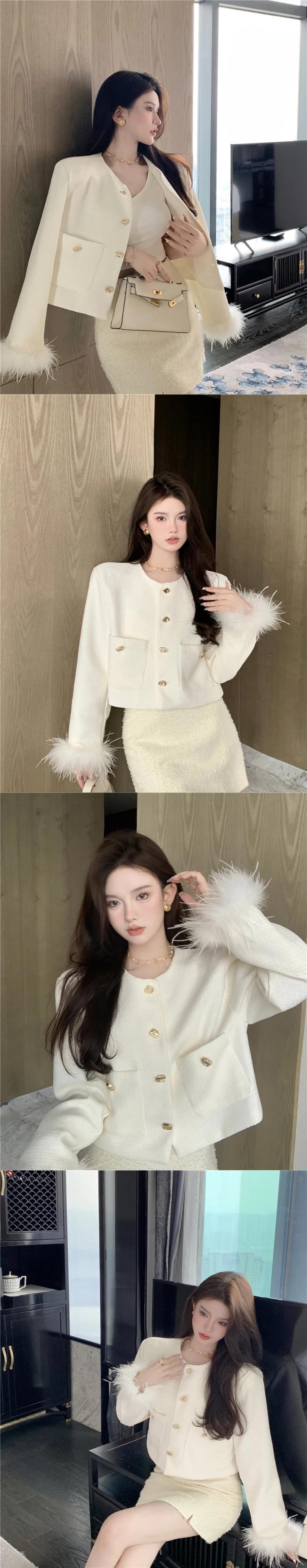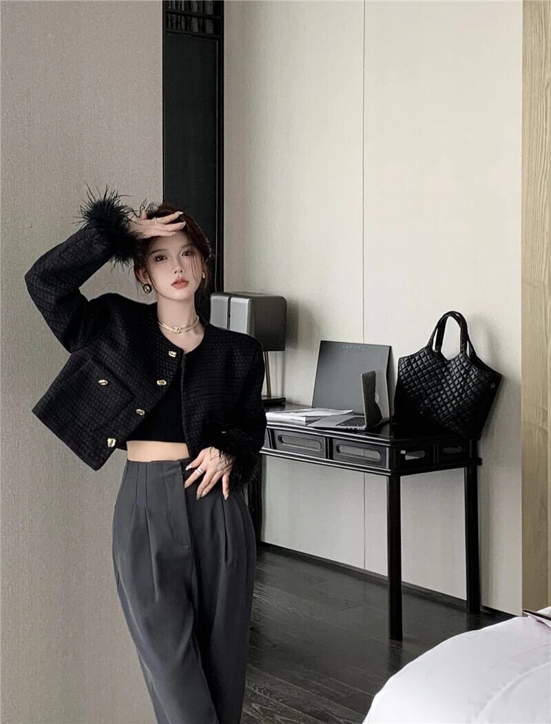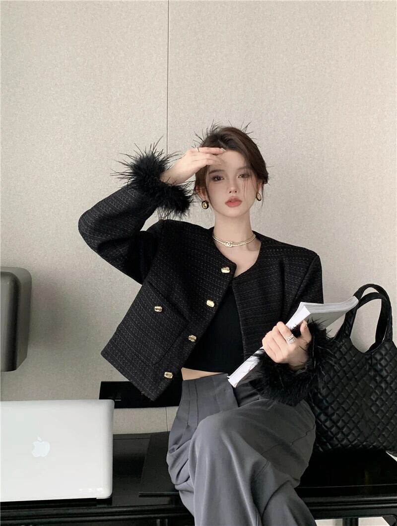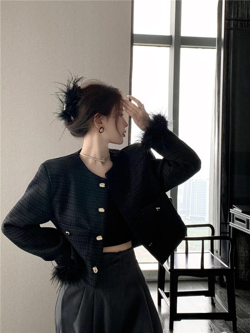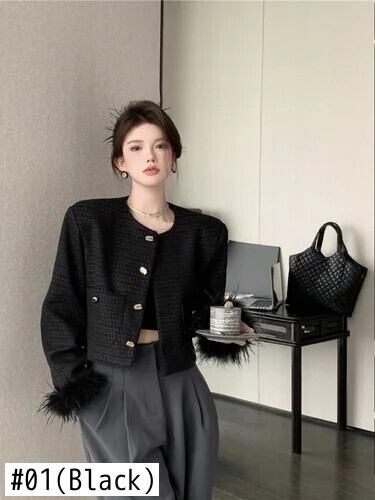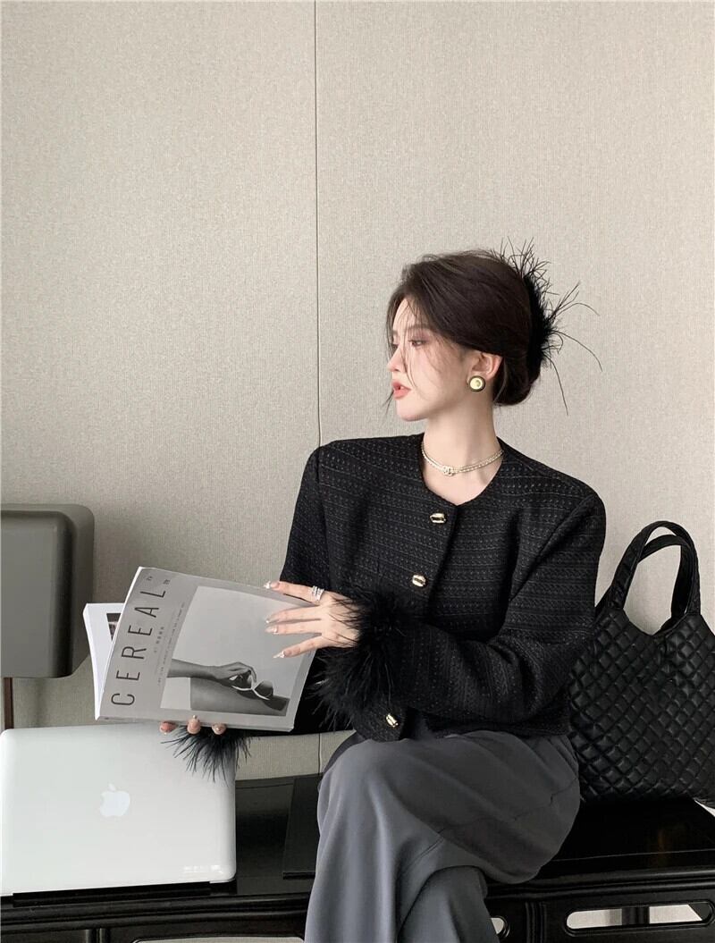 オフィスレディツイードコート秋ラウンドネックファー袖口ショート多用途シングルブレストジャケット オータム 秋物 Oネック 会社 学校 通勤や通学にも