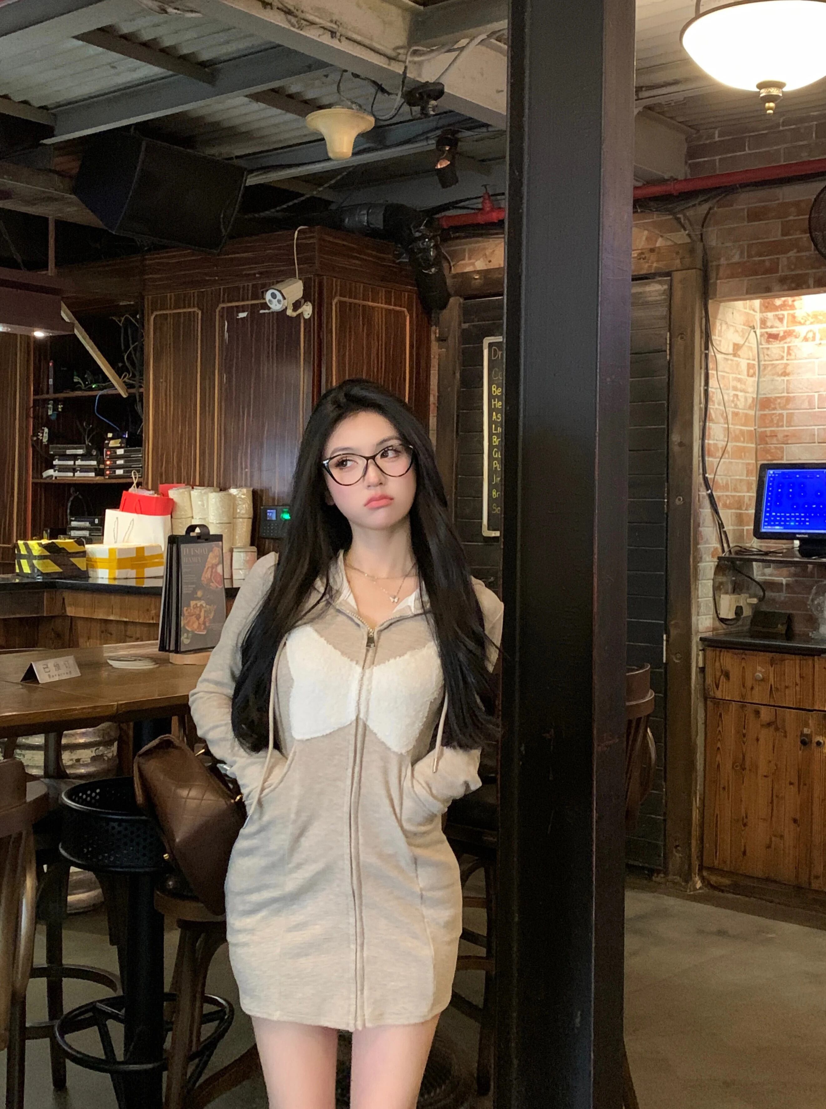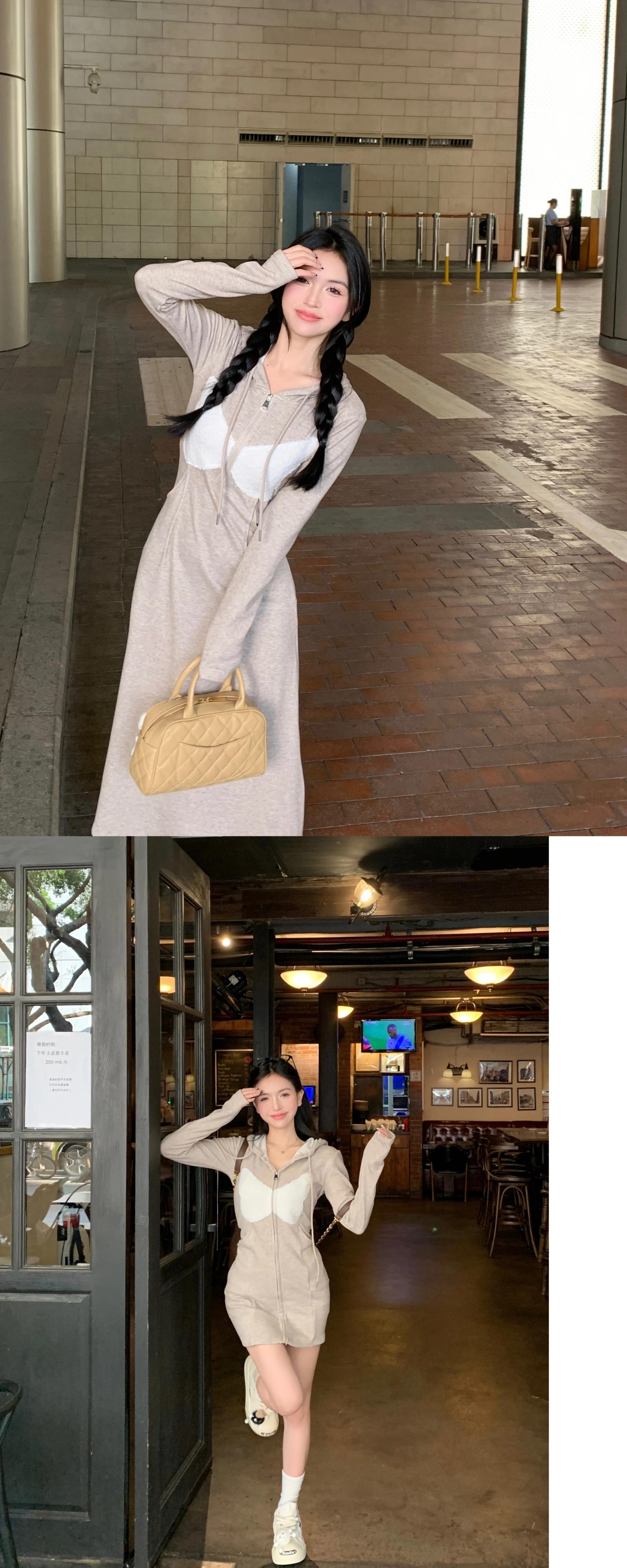 ホットガールスプライシングコントラストカラー長袖ドレス秋スリムフィットフード付きレトロ純粋セクシータイトラップヒップショートドレス ロング オータム 秋物 ピュア