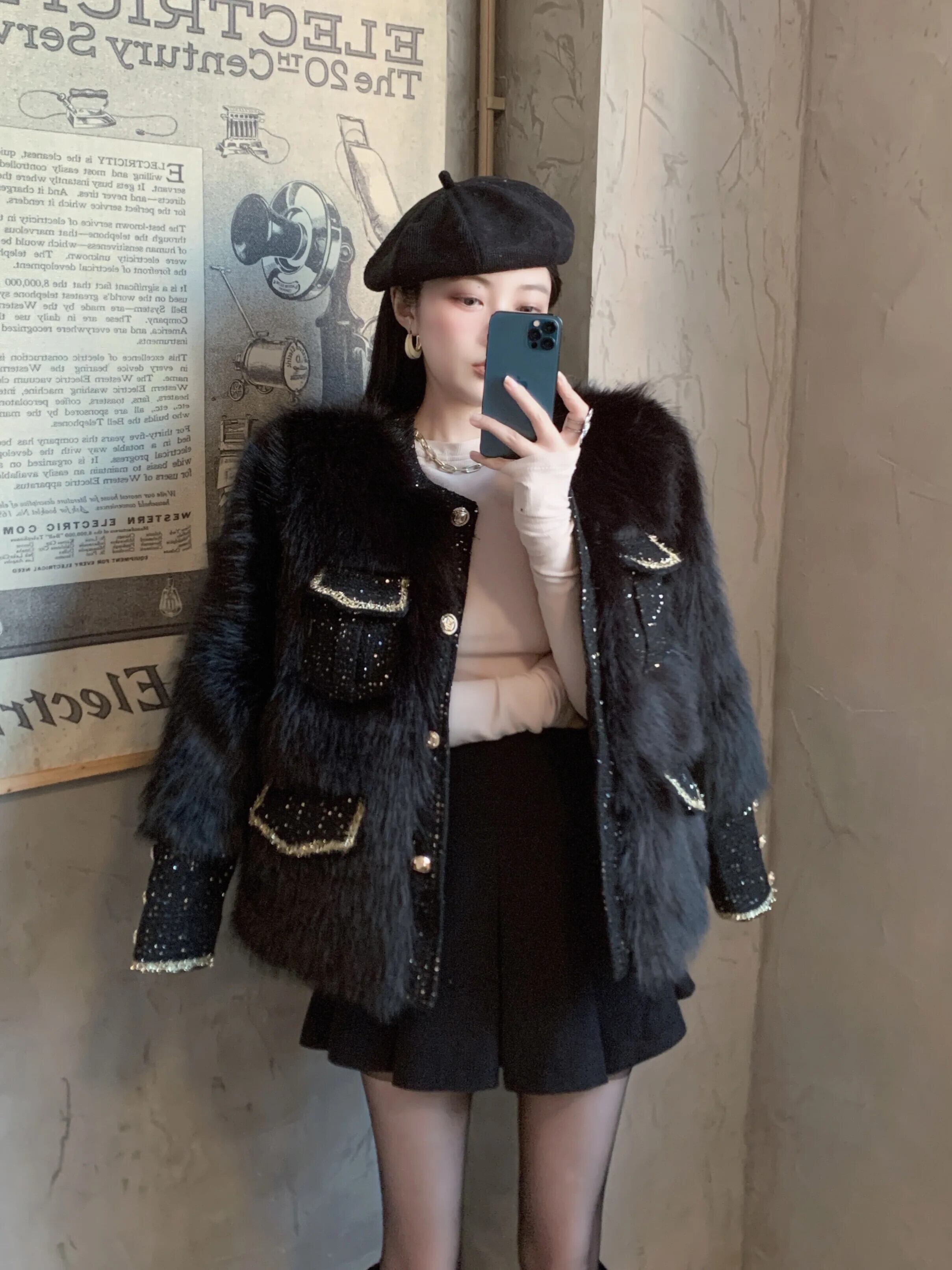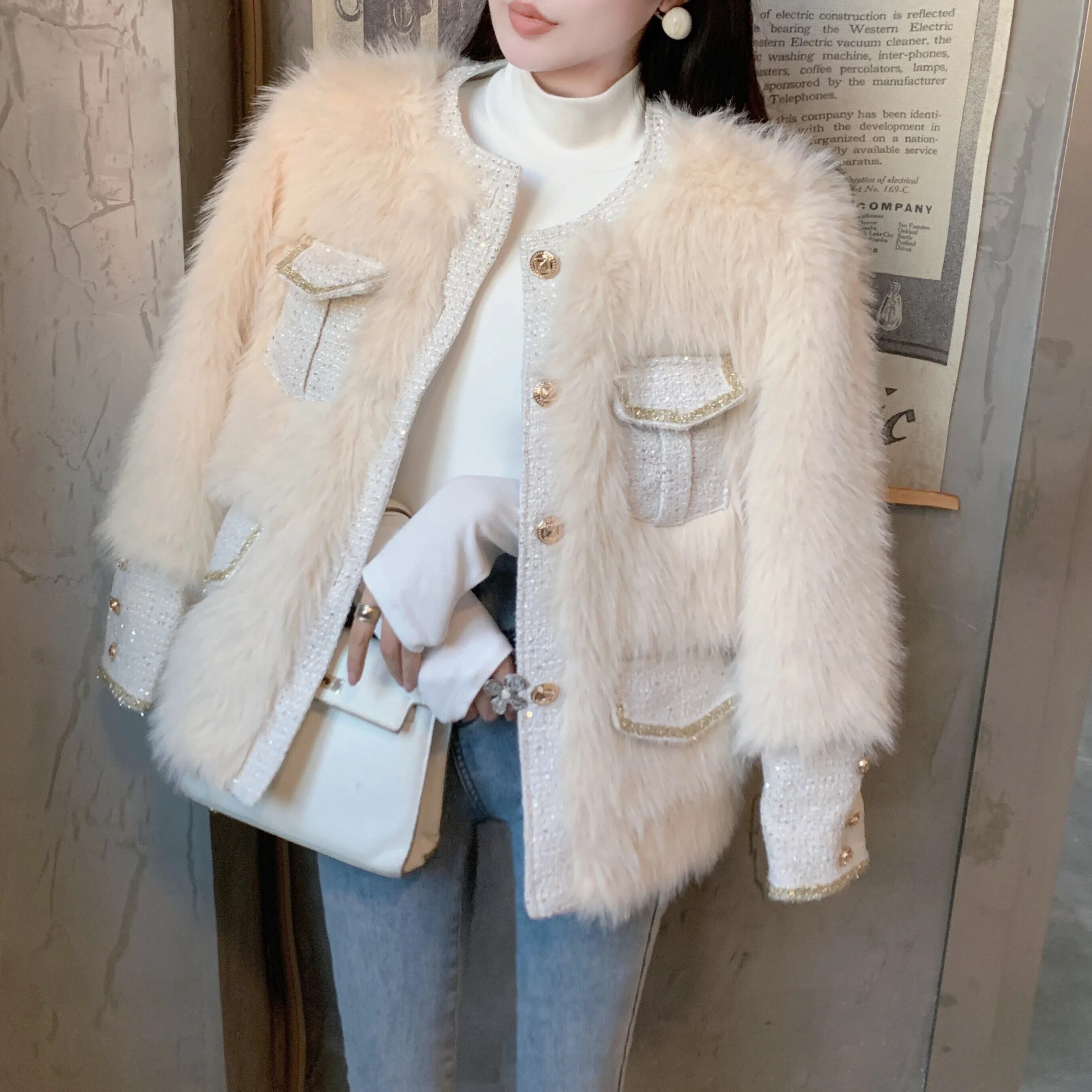 フレンチスタイルホットガールライト高級フェイクファーコート冬ラウンドネックスプライシングコットンジャケット ウィンター 冬物 Oネック