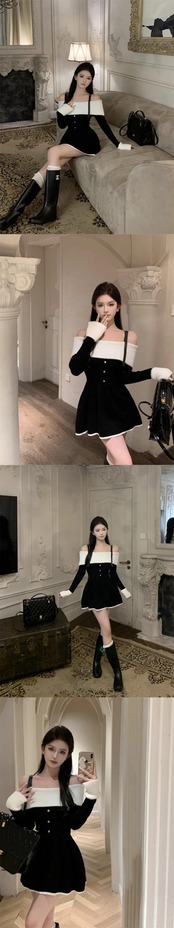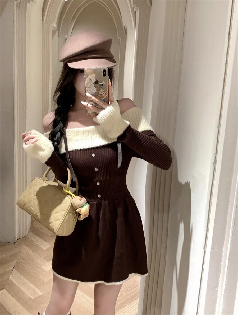 ホットガールオフショルダー長袖ニットストラップドレス秋スリムフィット A ラインカラーコントラストショートドレス ロング オータム 秋物 Aライン