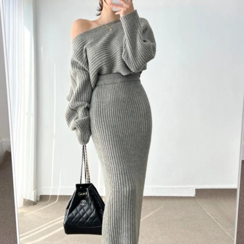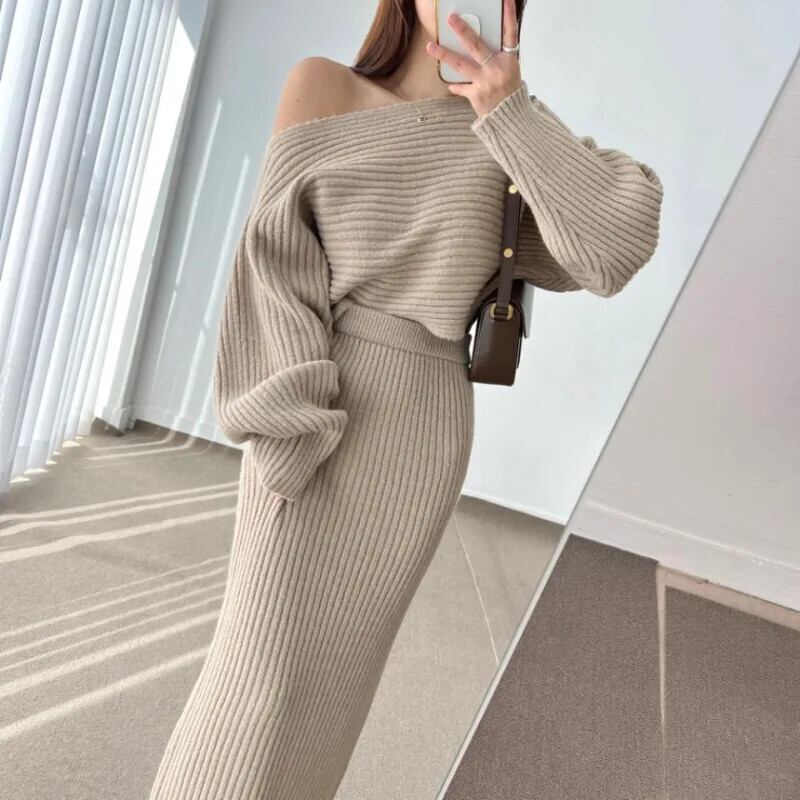 シックスーツ秋/冬オフショルダーショートセーターウエストラップヒップニットロングスカート2点セット オータム 秋物 ウィンター 冬物