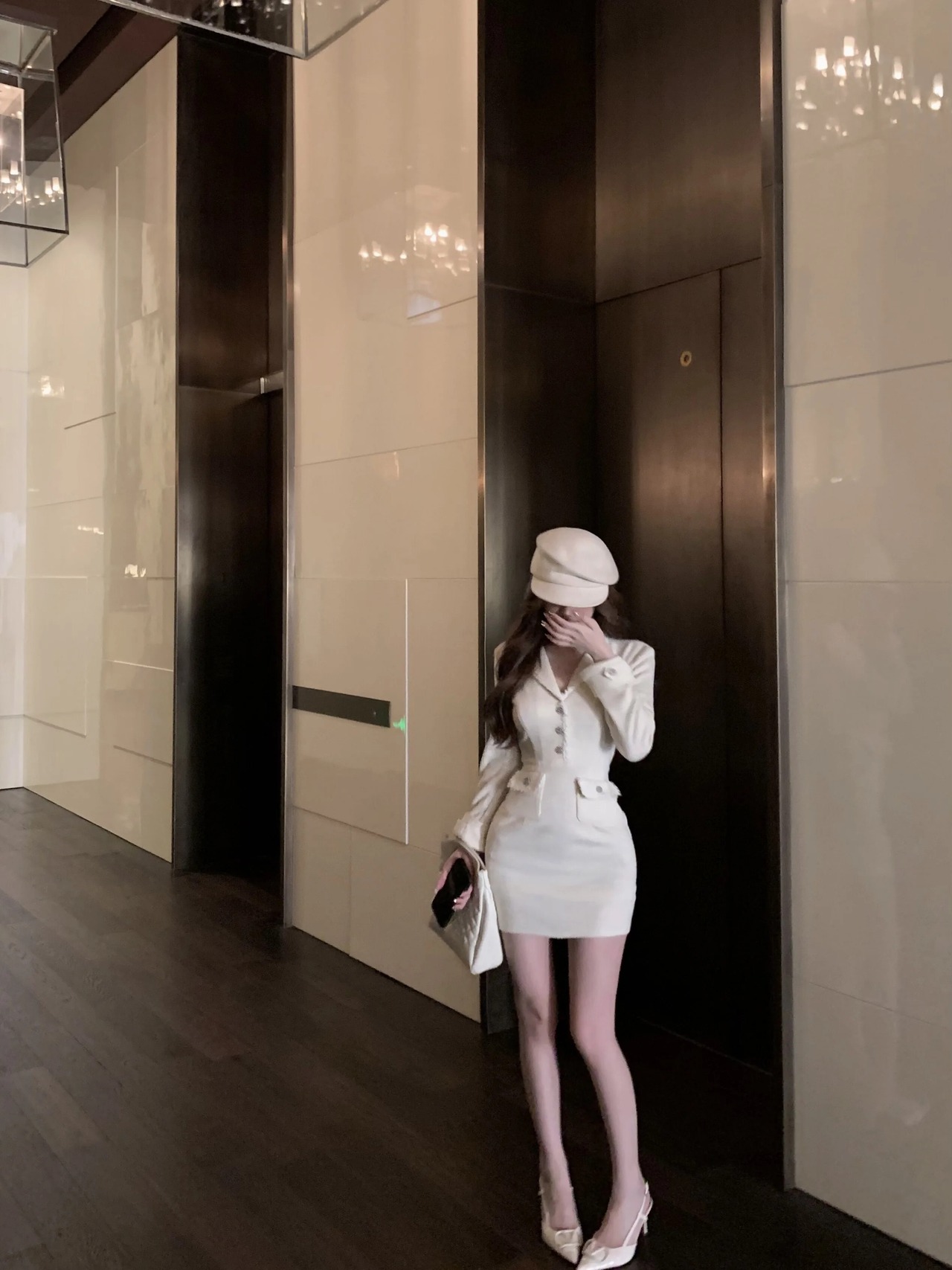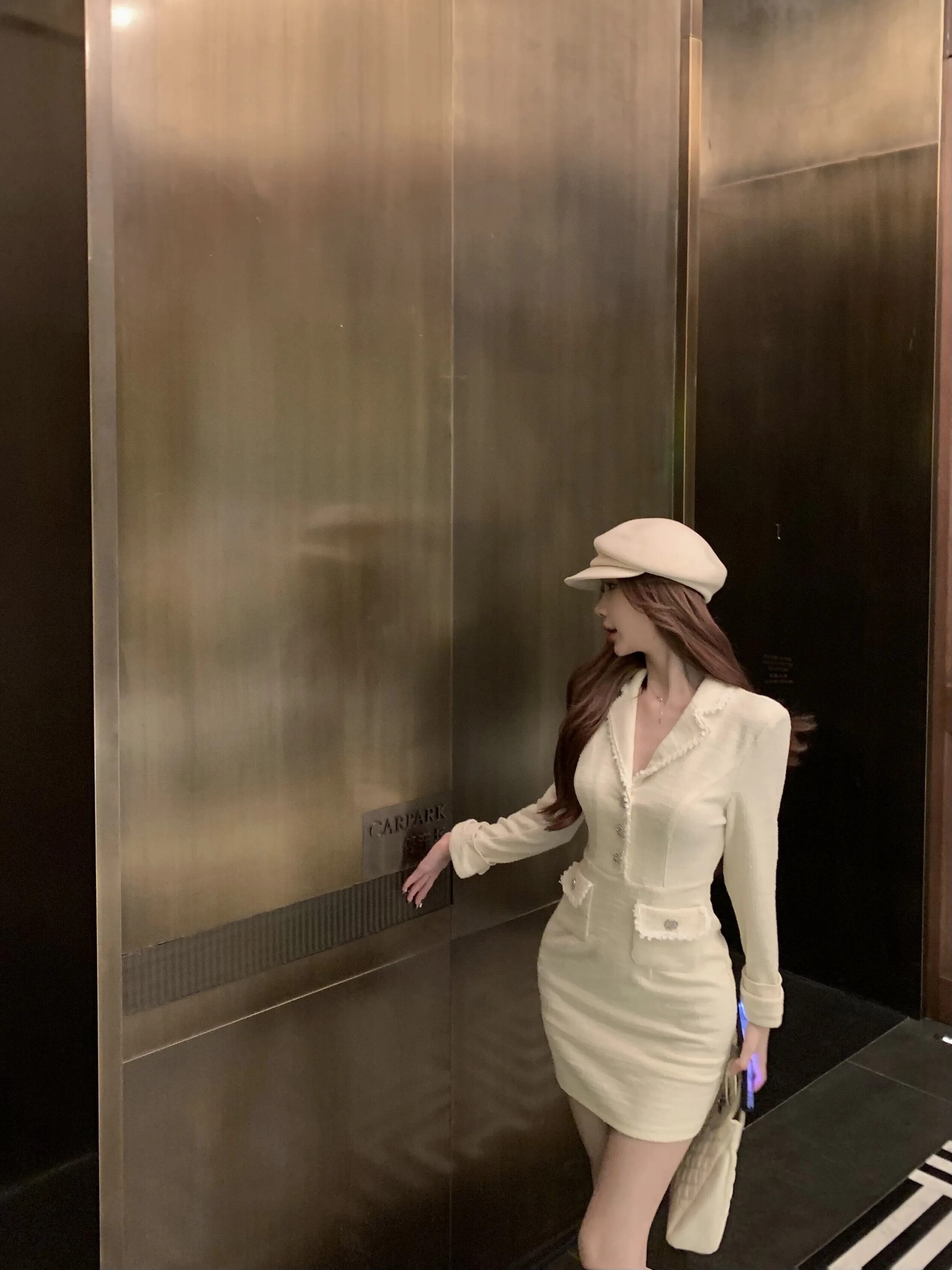 甘いホットガール白ウール長袖ドレス秋/冬スリムフィットラップヒップショートドレス ロング ホワイト 大人ガーリー スウィート キュート カジュアル オータム 秋物 ウィンター 冬物