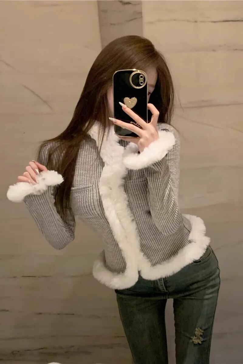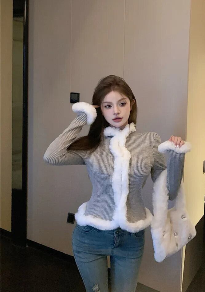 甘いホットガール毛皮エッジパッチワークセーター秋スリムフィット長袖ニットショートトップファッション ロング 大人ガーリー スウィート キュート カジュアル オータム 秋物