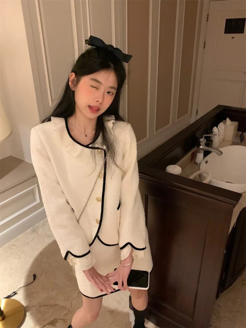 フレンチスタイルツイードスーツ秋シングルブレストコントラストコートトップミニスカートツーピースセット オータム 秋物