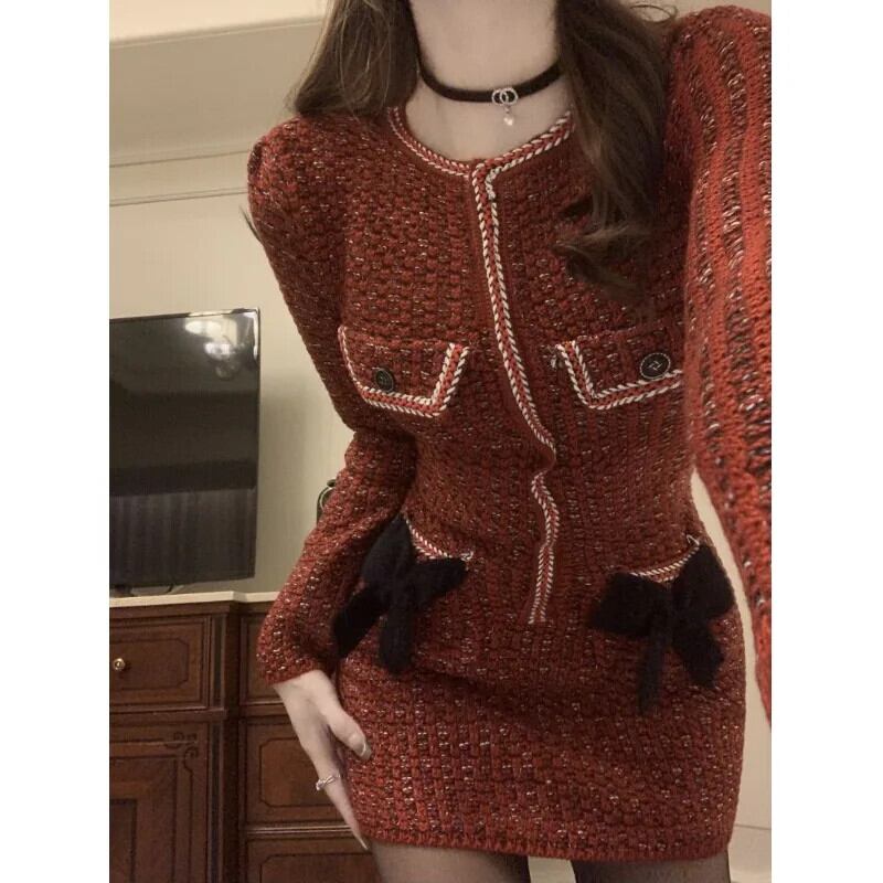 甘いホットガールクリスマスレッドリボンニットドレス秋スリムフィットラップヒップショートドレス 大人ガーリー スウィート キュート カジュアル オータム 秋物