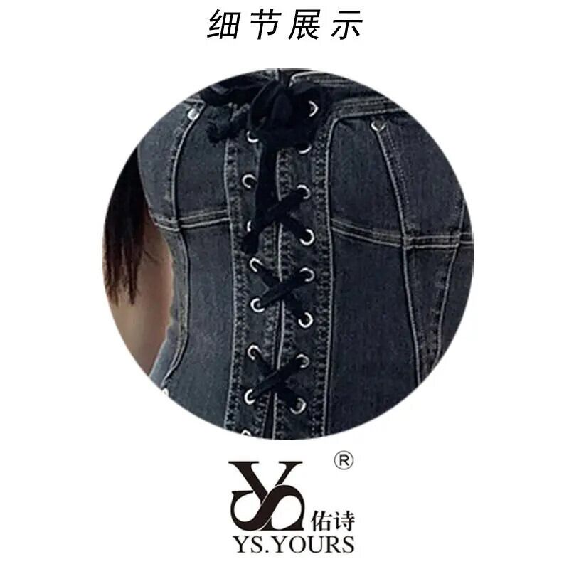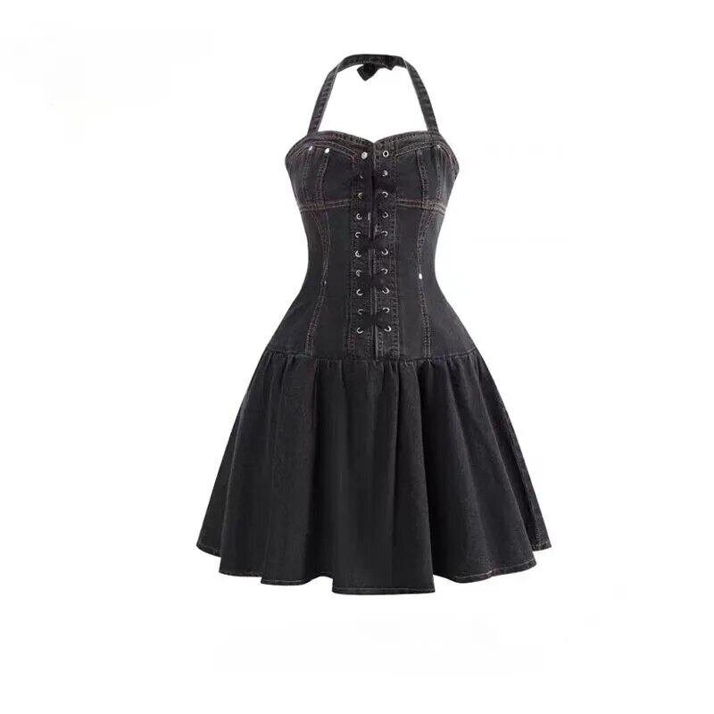 甘いホットガールデニムホルターネックドレス夏ストラップスリムフィット A ラインレースアッププリーツショートドレス 大人ガーリー スウィート キュート カジュアル サマー 夏物 Aライン