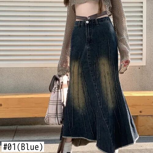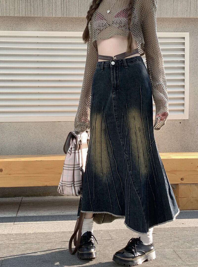 ホットガール香港スタイルルーズフィットマーメイドデニムロングドレス秋と冬レトロ洗浄スカート オータム 秋物 ウィンター 冬物