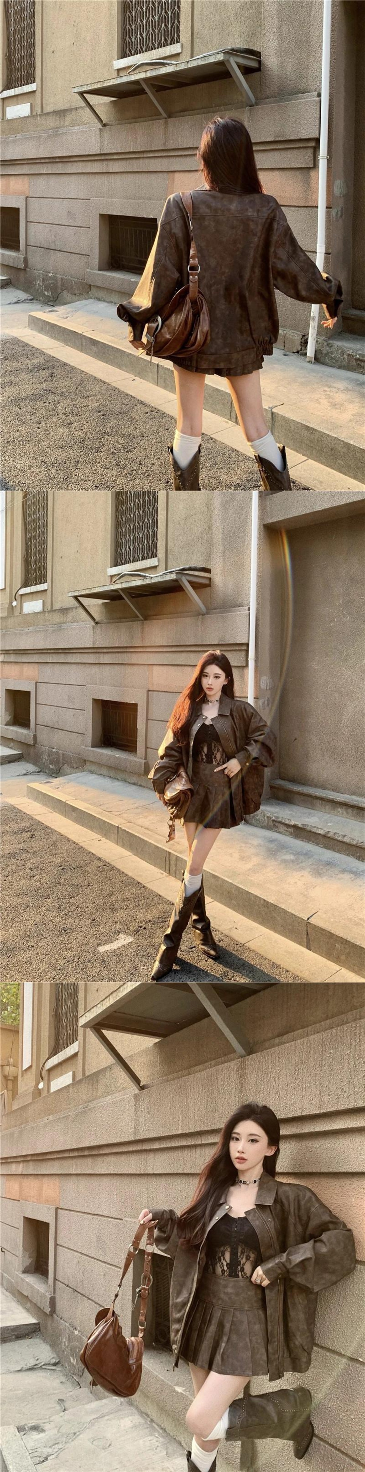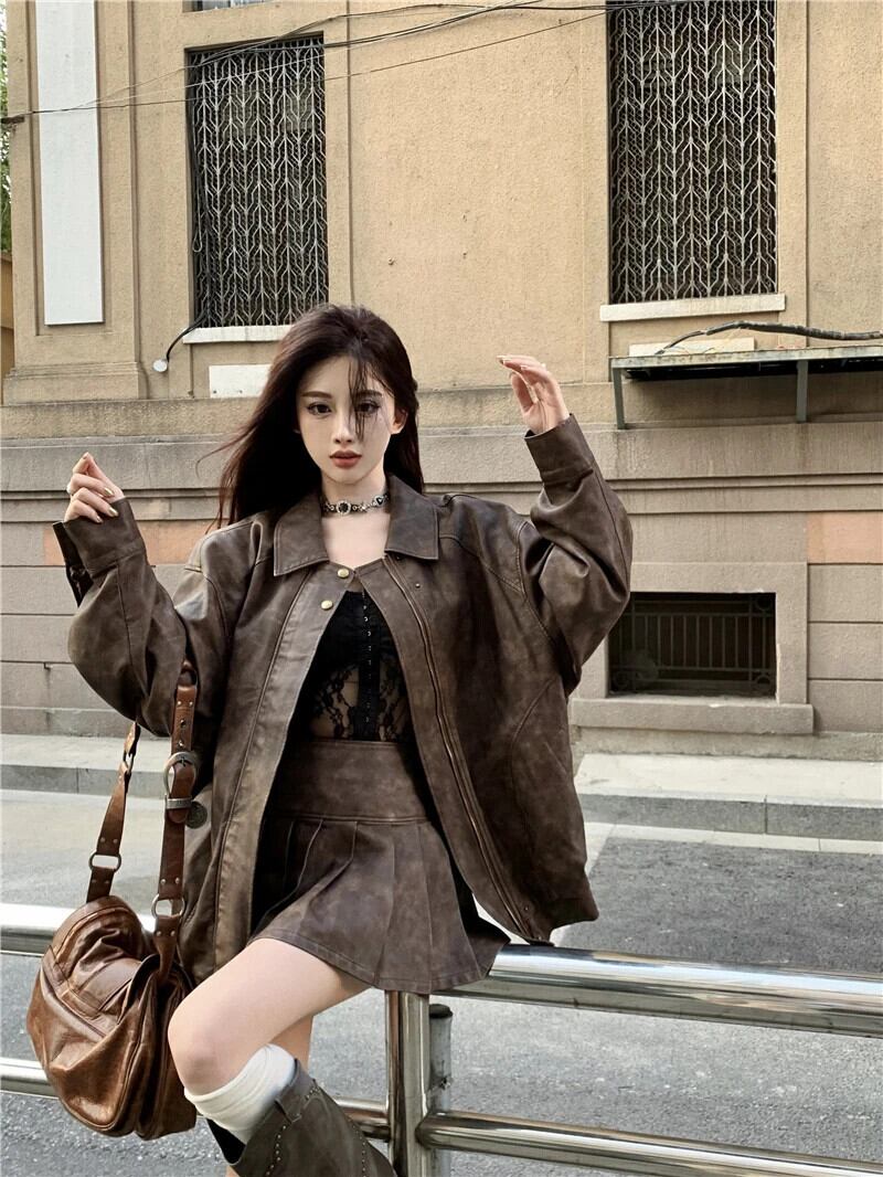 アメリカンレトロスーツ秋コーヒーレザーコートジャケットレザー A ラインショートスカート 2 点セット オータム 秋物 Aライン