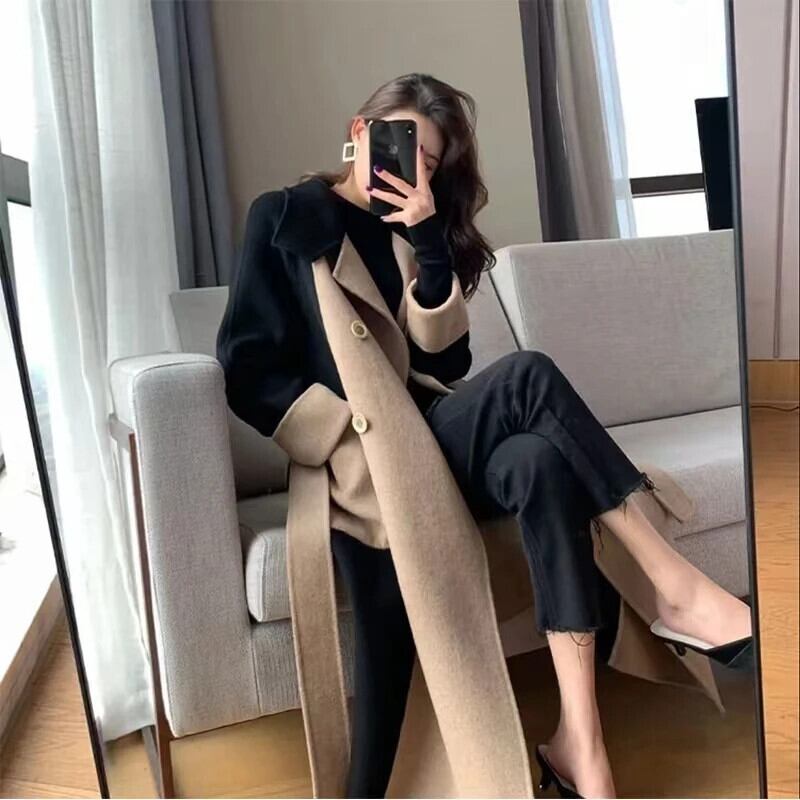 甘いホットガールロングウールコート冬カラーマッチングレースアップベルトダブルブレストコート 大人ガーリー スウィート キュート カジュアル ウィンター 冬物 ハーネス
