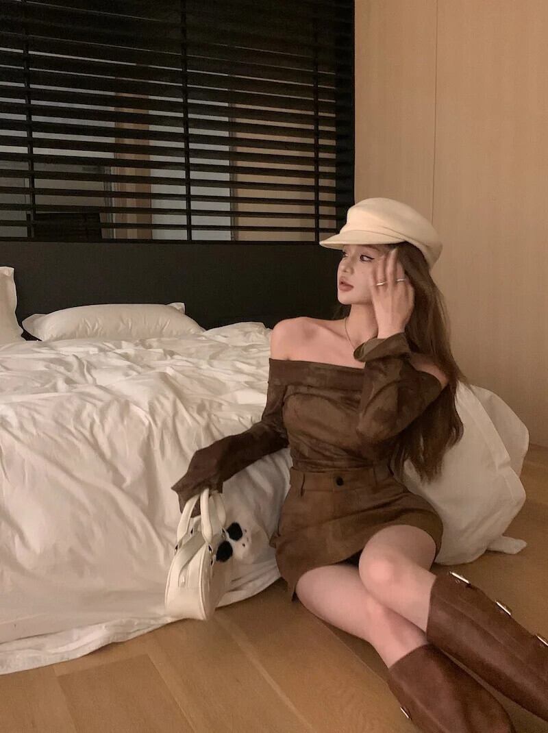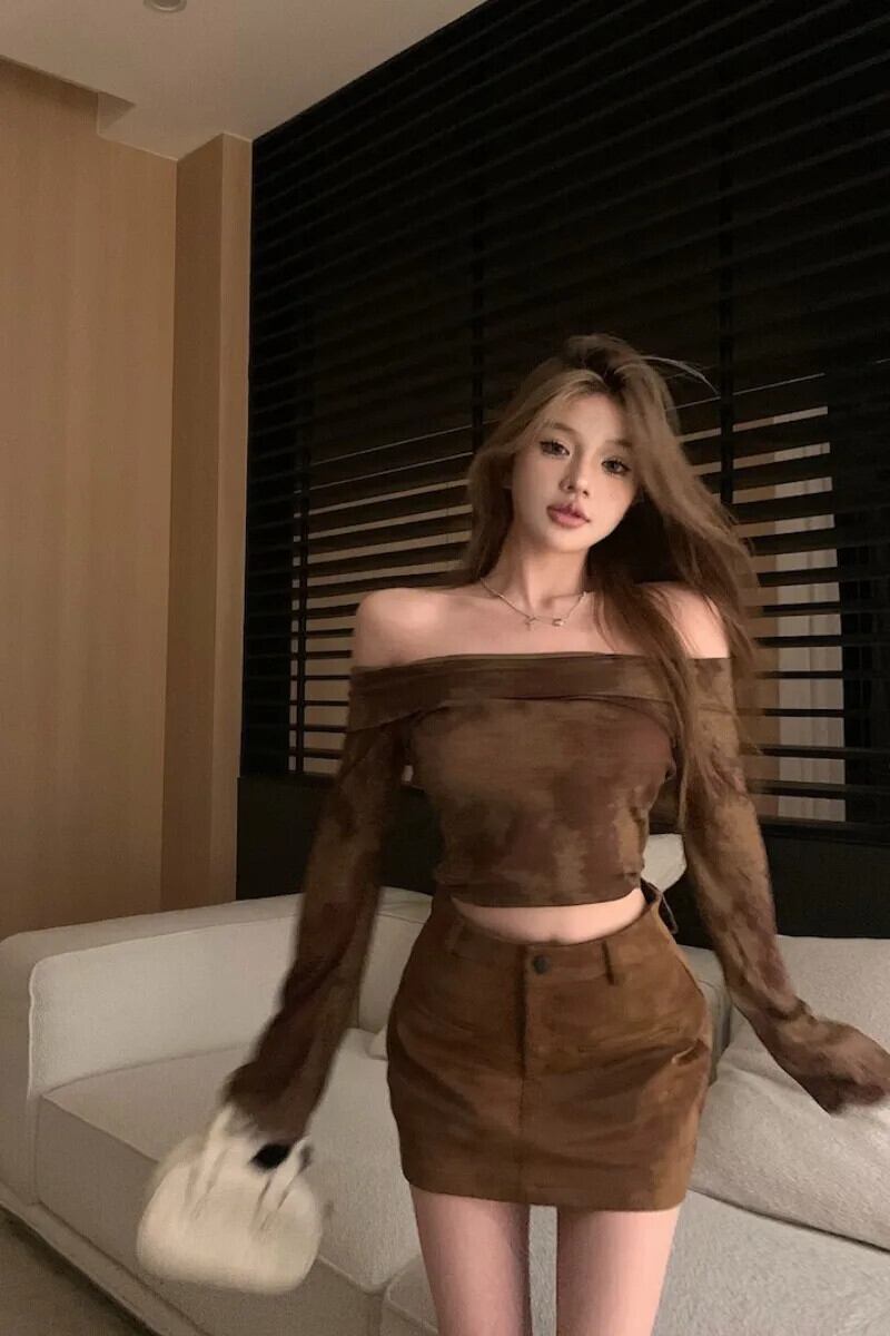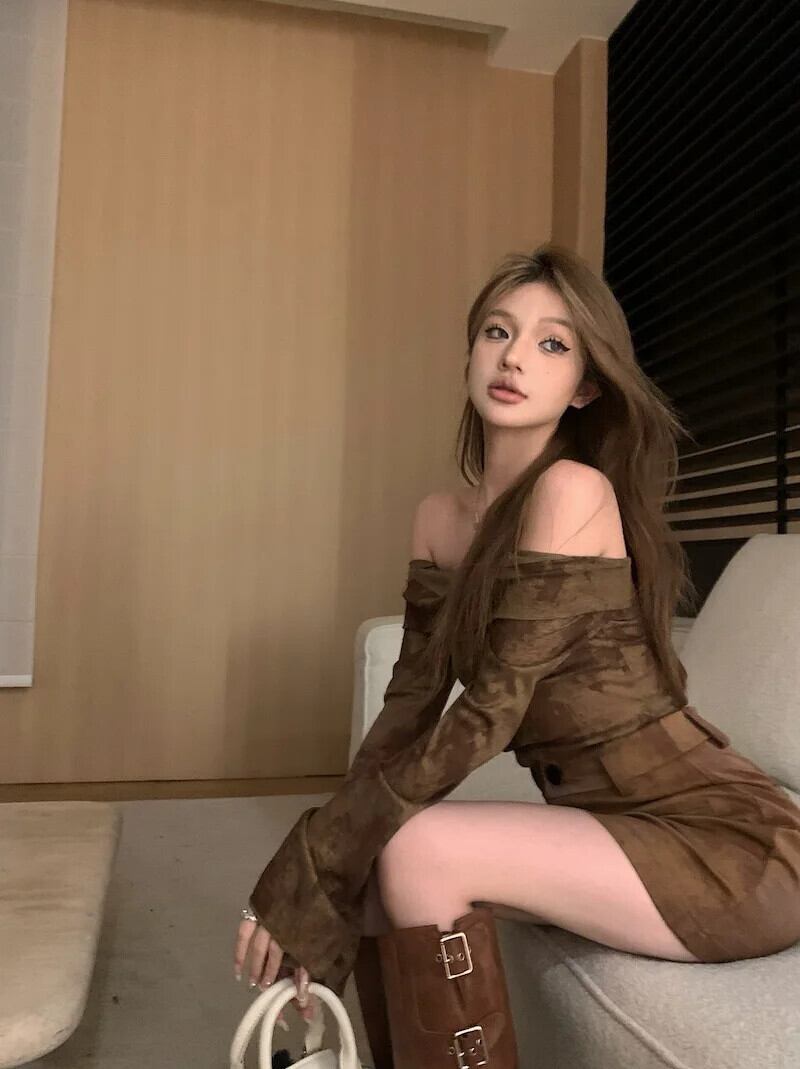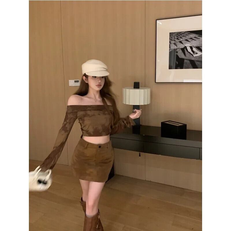 スタイルセクシーホットガールスーツ秋スリムオフショルダー長袖 Tシャツウエストラップヒップスカート 2 点セット ロング オータム 秋物