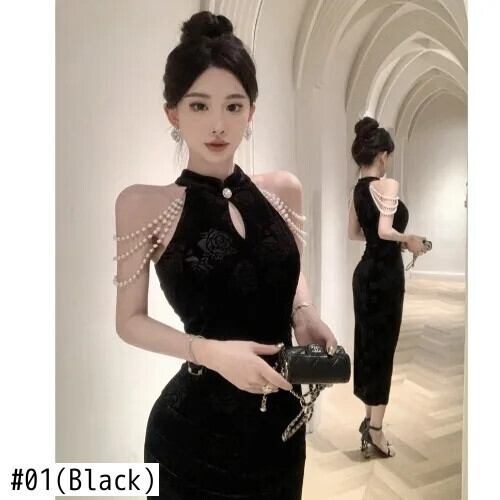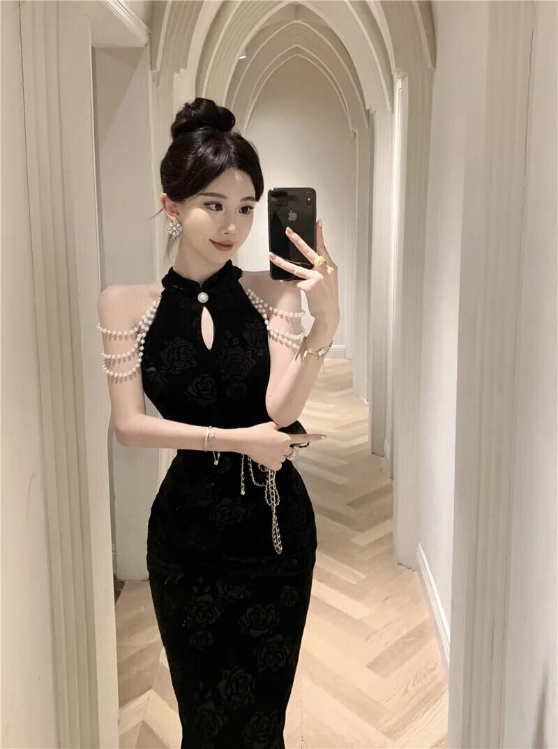 甘いホットガールレトロロングドレス子供秋ベルベットエンボスパールチェーンチャイナドレス 大人ガーリー スウィート キュート カジュアル オータム 秋物 真珠